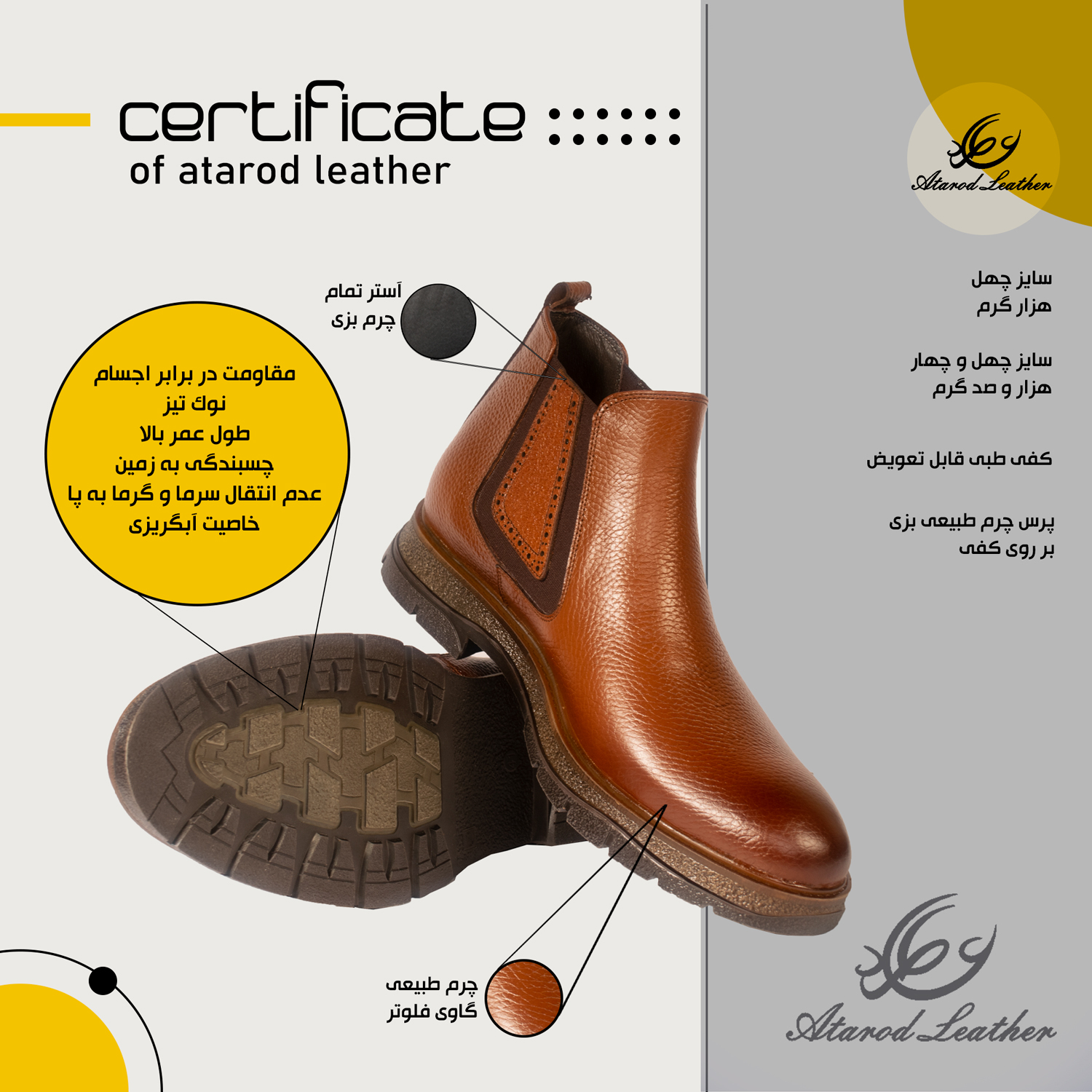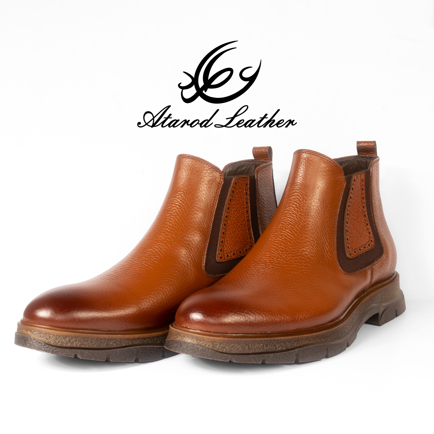 بوت لوکس برند چرم عطارد از لوکسترین و خاصترین چرم طبیعی ایران تولید شده است. تمام قسمت رویه کفش از «چرم طبیعی گاوی فلوتر برند چرم عطارد» تولید شده است. جنس آستر داخل کفش نیز «چرم طبیعی بزی» است. آستر داخل کفش از لوکسترین چرم طبیعی بزی تهیه شده است تا پای شما نهایت احساس راحتی را داشته باشد. حتی کفی کفش نیز تماما چرم طبیعی بزی است. جنس زیره کفش ترمو درجه یک بوده که ویژگیهای خاص این زیره در عکسهای آلبومی به تفسیر توضیح داده شده است. این محصول در بسته بندی اختصاصی برند چرم عطارد به صورت وکیوم شده و پلمپ برای شما عزیزان ارسال میشود که بسیار مناسب برای هدیه است.