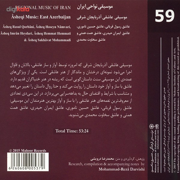 آلبوم موسیقی «عاشقی آذربایجان شرقی» اثری از «عاشق رسول قربانی» و شمارهی پنجاه و نهم از مجموعهی موسیقی نواحی ایران است. سایر خوانندگان این اثر «عاشق حسین ناموری»، «عاشق ایمران حیدری»، «عاشق همت همتی» و «عاشق سخاوت محمدی» نام دارند. نوازندگی ساز عاشقی، بالابان و قاوال در این آلبوم را عاشق رسول قربانی، عاشق حسین ناموری، عاشق ایمران حیدری، عاشق همت همتی، عاشق سخاوت محمدی، «بهرام نباتی»، «سلمان پور محمدی»، «علی حسین موحدی»، «شفاعت ایمانی»، «احد علیزاده»، «اعتماد امینی» و «نظام علی قره داغی» بر عهده دارند. این آلبوم شامل ۱۱ قطعه به نامهای «غربتی»، «یانیخ کَرَمی»، «اُشاری»، «شاختایی»، «جیرانی کَرَمی»، «دوبیتی»، «داغلار چیچَکی»، «روحانی»، «هِشتَری تَجنیسی»، «عثمانی» و «اِدمان دیوانی سی» میشود. موسیقی عاشقی آذربایجان شرقی و جمهوری آذربایجان بر اساس تعدادی آهنگ یا نغمه که «هاوا» نام دارند، شکل گرفتهاند. در گذشته، تعداد و عنوان هاواها به قدری زیاد بود که هیچ عاشقی تعداد دقیق آنها را نمیدانست. در همایش سالانهی عاشقها در سال ۱۹۸۰ در باکو، حدود هشتاد هاوا از میان بیش از سیصد هاوا انتخاب و مدون شدند و اغلب عاشقها بر این هشتاد هاوا که مستقل هستند، اتفاق نظر دارند. بیشتر عاشقهای ایران با سبکها و شیوههای مختلف هنر عاشقی آشنا هستند، اما دقت موجود در تقسیم بندی مکتبها و سبکهای موسیقی عاشقی جمهوری آذربایجان در موسیقی عاشقی آذربایجان شرقی دیده نمیشود. موسیقی عاشقی آذربایجان شرقی که امروزه توسط آواز و ساز عاشقی، بالابان و قاوال اجرا میشود، نمونهای درخشان و ماندگار از هنر عاشقی است. یکی از ویژگیهای عمدهی این موسیقی سنت داستان گویی است که ریشه در هنر خنیاگران قدیم دارد. عاشق با ساز و آواز خود داستان را روایت میکند و حتی روال داستان را تغییر میدهد و متناسب با شرایط و اقتضای حال به بداهه سرایی میپردازد. مجموعه موسیقی نواحی ایران با حمایت موسسه «ماهور» برای معرفی و ثبت و ضبط موسیقی نقاط گوناگون ایران و به کوشش و اهتمام «محمد رضا درویشی» تهیه و منتشر میشود. درویشی آهنگساز، پژوهشگر موسیقی و مولف دایرهالمعارف سازهای ایران است. وی نزدیک یست سال پیش سفر به مناطق مختلف ایران را آغاز کرده که نتیجهی آن ثبت و ضبط آثار موسیقایی خاص هر منطقه بوده و موسسهی ماهور این آثار را در قالب مجموعهای به نام موسیقی نواحی ایران منتشر کرده است. آلبوم موسیقی عاشقی آذربایجان شرقی شامل تعدادی از معروفترین نغمههای هنر عاشقی است که در قالب یک حلقه سیدی صوتی در اختیار علاقهمندان قرار گرفته است.