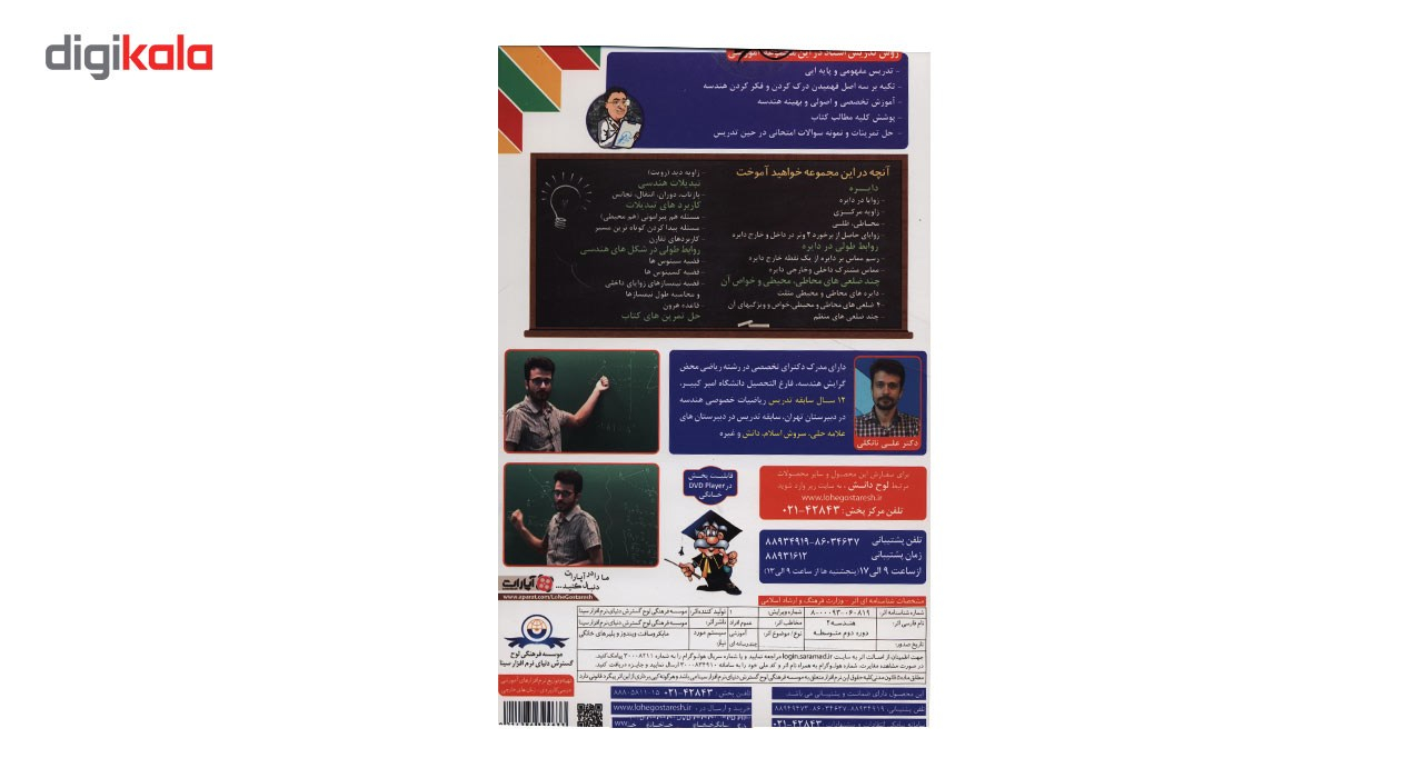 درس شیرین و در عین حال پر از نکتهی هندسه نیاز به آموزشی بیش از زمانی است که در کلاسهای درس به آن پرداخته میشود. «آموزش تصویری هندسه ۲» همچون یک مربی در منزل، به دانشآموزان پایهی یازدهم رشتهی ریاضی و فیزیک در درس هندسه کمک میکند. با بهرهگیری از نکات و آموزشهای تصویری این محصول، مفاهیم بهاصطلاح ملکهی ذهن دانشآموزان میشود. «لوح دانش» با همکاری موسسهی «دنیای نرمافزار سینا» محصول پیش رو را بهطور مفصل و در قالب دو حلقه دیویدی با تدریس «علی نانکلی» برای دانشآموزان پایهی یازدهم ارائه کرده است. روش تدریس در این مجموعه بدین ترتیب خواهد بود: تدریس مفهومی و پایهایی، تکیه بر سه اصل فهمیدن درک کردن و فکر کردن هندسه، آموزش تخصصی و اصولی و بهینه هندسه، پوشش کلیه مطالب کتاب، حل تمرینات و نمونه سوالات امتحانی در حین تدریس. سرفصلهای مطالب آموزشی این محصول عبارتند از: زوایا در دایره؛ زوایه مرکزی؛ محاطی، ظلی؛ زوایای حاصل از برخورد ۲ وتر در داخل و خارج دایره؛ رسم مماس بر دایره از یک نقطه خارج دایره؛ مماس مشترک داخلی و خارجی دایره؛ دایرههای محاطی و محیطی مثلث؛ ۴ ضلعیهای محاطی و محیطی، خواص و ویژگیهای آن؛ چند ضلعیهای منظم؛ زوایه دید؛ بازتاب، دوران، انتقال، تجانس؛ مسئله هم پیرامونی؛ مسئله پیدا کردن کوتاهترین مسیر؛ کاربردهای تقارن، قضیه سینوسها؛ قضیه کسینوسها؛ قضیه نیمسازهای زوایای داخلی و محاسبه طول نیمسازها و قاعده هرون. انتشارات لوح دانش این منبع کمکآموزشی را با برخورداری از بهترین کیفیت و با قابلیت اجرا در رایانههای شخصی و دستگاههای پخش خانگی، برای دانشآموزان پایهی یازدهم ارائه کرده است.