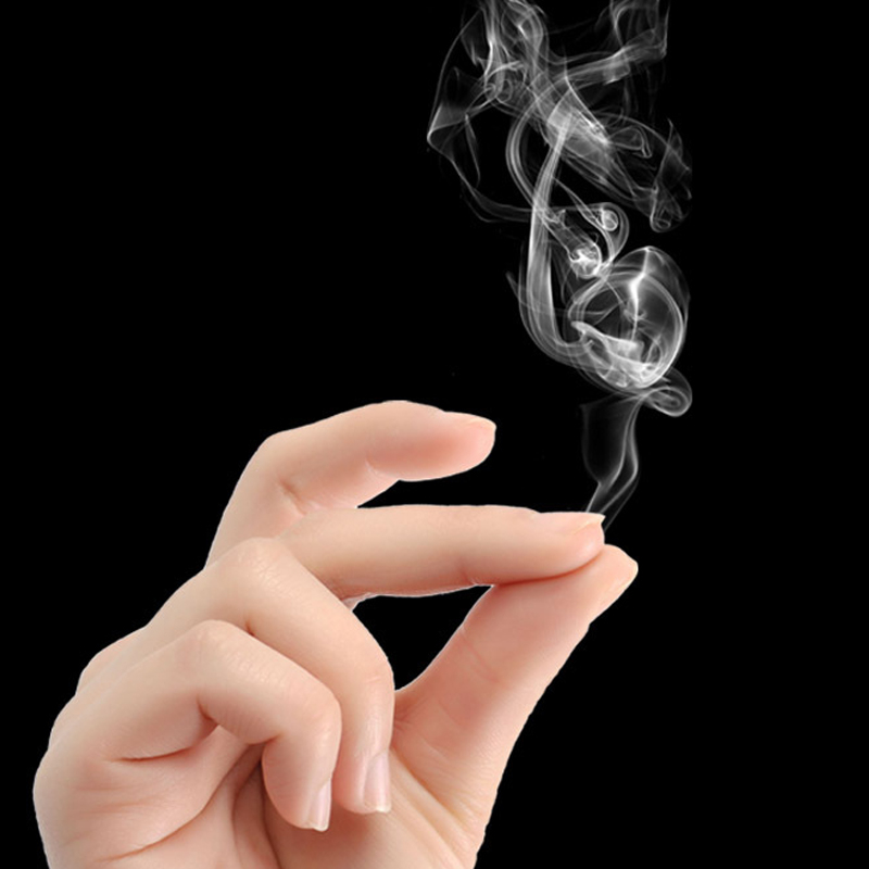 شعبده باز انگشت شست و سبابه را به آرامی به هم می مالد،و دود از بین دو انگشتش بلند می شود.و تعجب همگان را به خود جلب می کند.