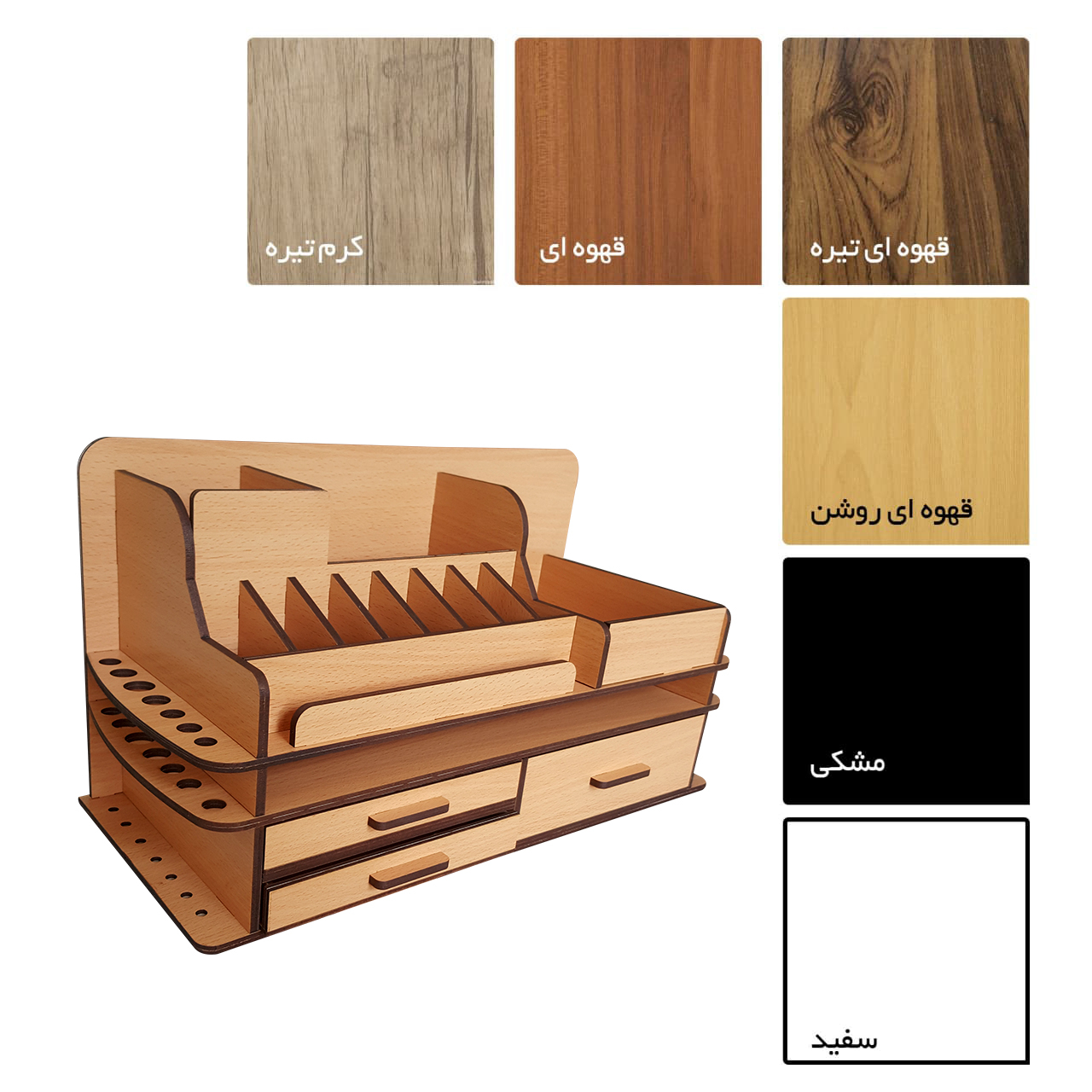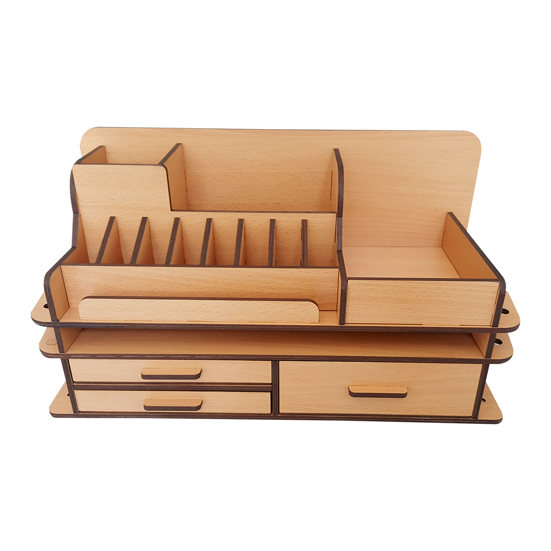 استند آرایشی دکو مارکت مدل ۵۶-۴ دارای ۳ کشو در سایزهای مختلف و قسمتی برای قرار گرفتن انواع رژ و عطر و ادکلن در نظر گرفته شده است.این نظم دهنده مورد استفاده برای نظم دادن به لوازم آرایشی، لوازم تحریر، ابزارآلالت مختلف، وسایل خیاطی و حتی آچار و پیچ گوشتی و تمام وسایلی که همواره بی نظمی روی میز ایجاد میکند قابل استفاده است.