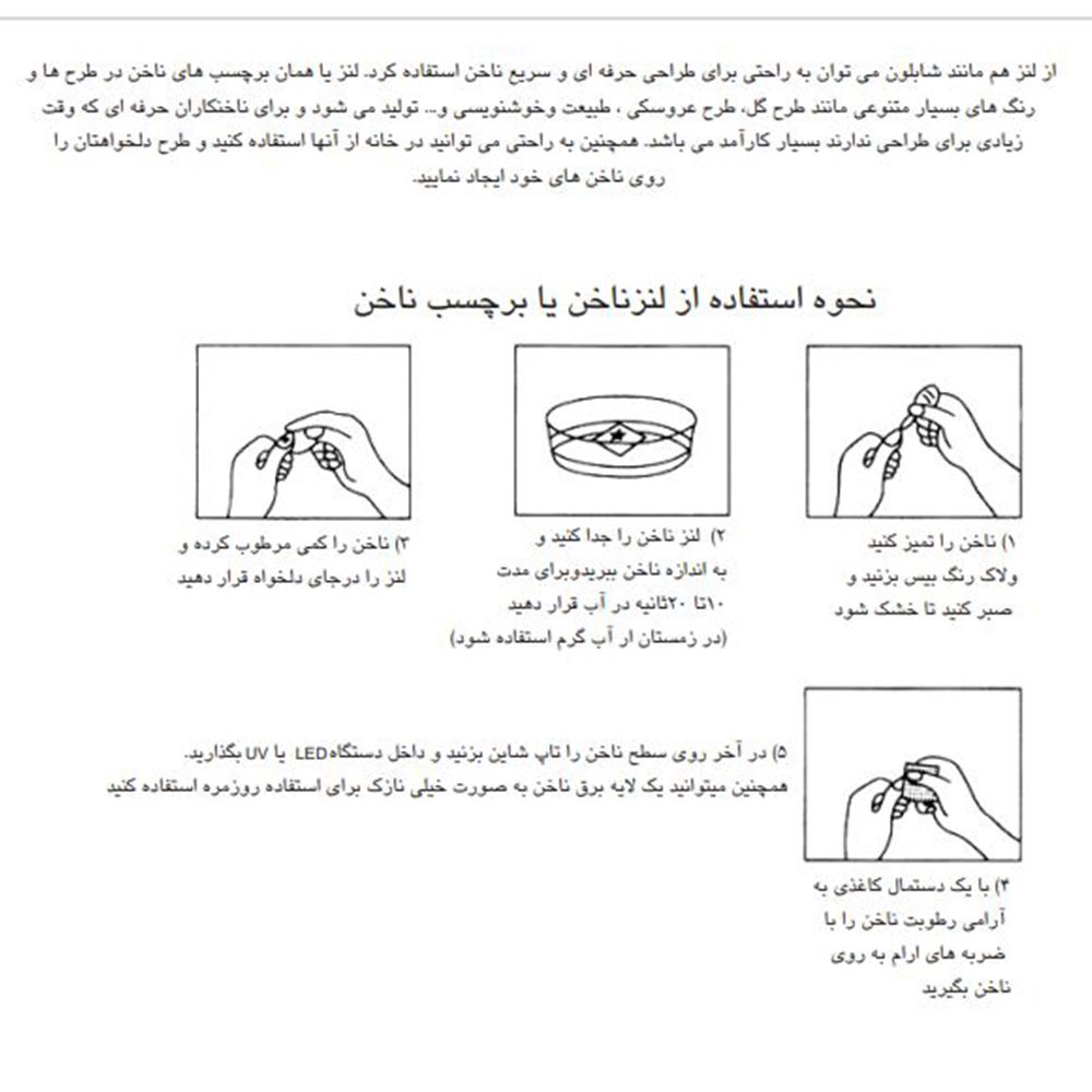 جهت استفاده از این محصول تنها کافیست طرح مورد نظر را انتخاب کرده، برش زده، چند ثانیه در آب آشامیدنی قرار دهید و روی ناخن بچسبانید.