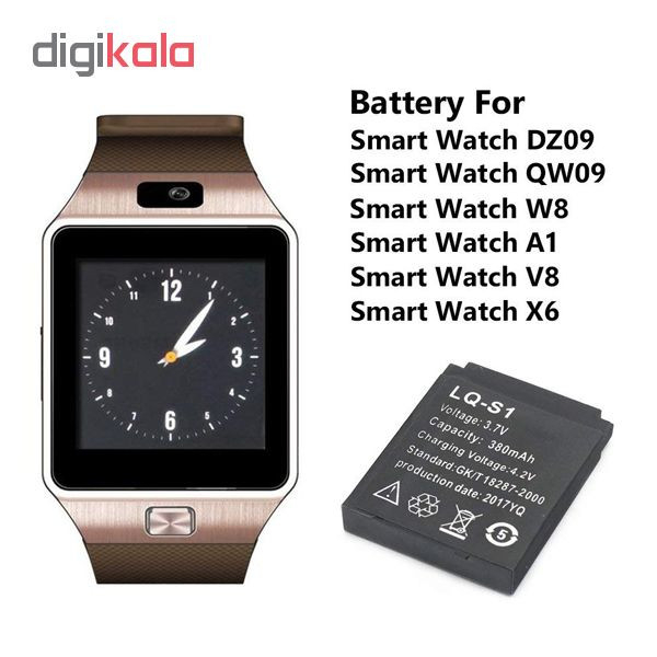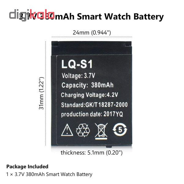 با از کار افتادن یا باد کردن باتری آن، با مشکل روبرو شده و دستگاه شما قابل استفاده نباشد. باتری با ظرفیت اسمی ۳۸۰ میلی آمپر، از کیفیت ساخت مطلوب برخوردار بوده و خیال شما را از این بابت آسوده خواهد کرد. مدلهای مختلفی از باتریهای ۳ pin در بازار موجود است اما شکل ظاهر و خصوصا خارهای آن ها با هم متفاوت می باشد. لذا بسیار ضروریست که به عکسها دقت کنید و مدل مورد نیاز خود را تهیه کنید. در ضمن از آنجا که در باتری های لیتیوم یون زمان ساخت بسیار مهم است تاریخ تولید باتری پریمیوم رو آن درج شده که میتوانید از جدید بودن آن اطمینان حاصل نمایید. این محصول اکثر مدلهای ساعت مچی هوشمند را ساپورت میکند. که از جمله آنها میتوان به مدلهای y1, y1s , A06 , V6 , X6 , Q18 , W05 , W07, DZ09 , V8 , J05 , Z60 , A1 و بسیاری دیگر از مدلها اشاره داشت. ولتاژ این باتری ۳.۷V می باشد و وزن آن حدودا ۲۰ گرم می باشد.