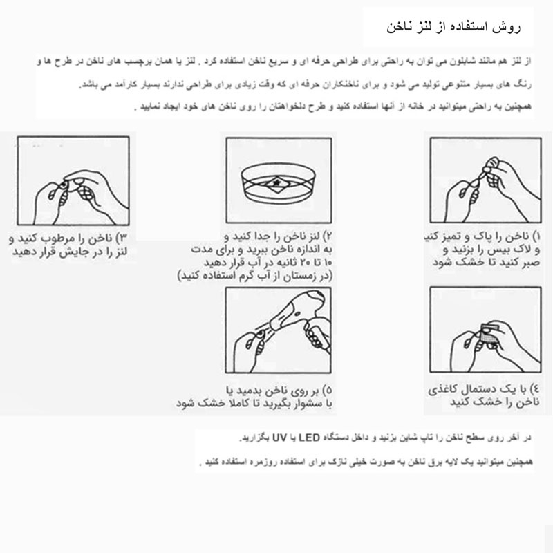 استفاده از این لنز های ناخن به حدی راحت است که شما میتوانید در منزل هم از آنها استفاده کنید و از زیبایی آن لذت ببرید. طرحهای لنز ناخن بسیار خاص و منحر به فرد بوده و به دلیل تنوع بسیار مطابق با هر سلیقه ای است. این لنز های ناخن از جنس کاغذ بوده و روی آنها یک لایه نایلونی نازک از طرح مورد نظر قرار دارد. برای نصب این لنز ها کافی است ابتدا طرح مورد نظر خود را جدا کرده و سپس کاغذ زیری را مقداری خیس کنید یا در لیوان آب قرار دهید. پس از چند ثانیه لایه رویی طرح جدا شده را بوسیله یک انبر از آب بیرون بیاورد . اکنون لنز آماده برای نصب بر روی ناخن شما خواهد بود. اگر ناخن شما دارای لاک نیمه خشک باشد لنز محمکتر بر روی ناخن شما قرار خواهد گرفت. سپس قسمتهای اضافی لنز ناخن را با استفاده از سوهان ناخن جدا کنید و برای فیکس شدن بهتر نیز میتوانید از تاپ کات یا براقکننده ناخن استفاده کنید.