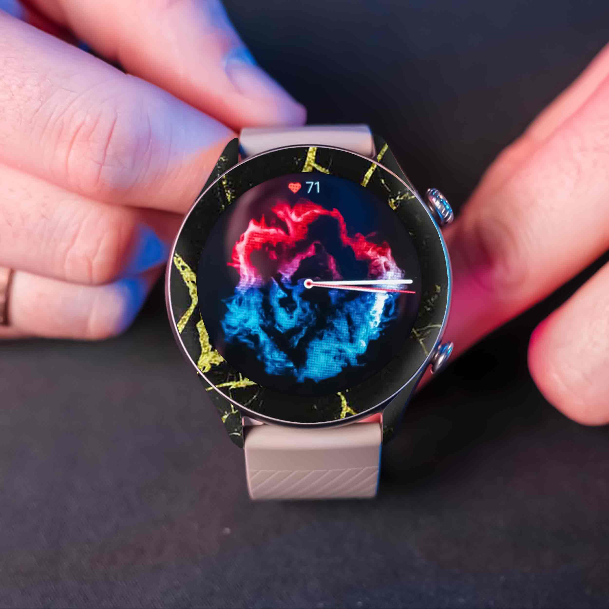 طرح مرمر گرافیت طلایی، محصولِ برند ماهوت میباشد. در توضیح ساختار فنی برچسب طرح ساعت هوشمند ماهوت میتوان گفت تصویر بر روی لایه اولِ برپوش، مستقیما با یک تکنیک منحصربفرد چاپ میشود. همچنین بخش چسبنده دارای تکنولوژی Bubble Free است که نصب را آسان و چسبندگی را حداکثر میکند و هیچ اثری از چسب، بر روی ساعت هوشمند باقی نمیگذارد. در لایه دوم یک ورق لمینت گرم، با دستگاههای مخصوص در دمای بالا بر روی لایه اول اعمال می شود تا مقاومت در برابر مواد شیمیایی و خط و خش و آب خوردگی حداکثر شود. این محصول نوعی استیکر(برچسب) چندلایه است و به منظور پوشش تمامی وجوه ساعت هوشمند ساخته شده است و کنارههای دستگاه را هم پوشش میدهد. هدف استفاده از آن ایجاد طرح، رنگ و احساسی نو برای دستگاه هوشمند است در حالی که زبان طراحی و ظرافت ساعت هوشمند حفظ شود. لازم به ذکر است که برچسب پوششی ماهوت با وجود چسبندگی بالا هیچی اثری از خود هنگام جدا شدن برجای نمیگذارد. همچنین جنس این محصول از پلیکربنات است و این ماده تاثیر قابل توجهی بر روی آنتن دهی و یا دفع حرارت دستگاه نخواهد داشت. داخل جعبه محصول دو سری برپوش قرار داده شده است تا عمر استفاده از محصول بالا برود.