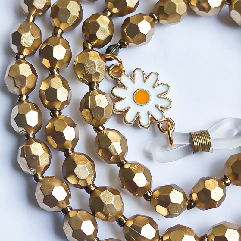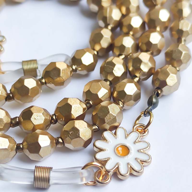 با طراحی و ساخت مدل های خلاقانه متناسب با سلیقه خاص مشتری های عزیزمان محصولی خلق کردیم که به صورت محدود ساخته شده و عدم تکرار در ساخت آن با هدف برانگیختن حس یونیک و خاص بودن شما است. محصول پیش رو از سری بند عینک های دست ساز است که از مهره های تراش دار طلایی و اویز گل ساخته شده است.
