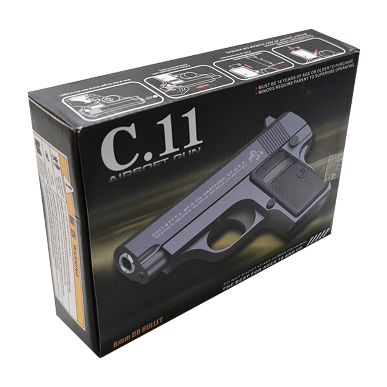 بازی کردن با تفنگ اسباب بازی می تواند به ارمغان آورنده ی هیجان بسیار زیادی برای کودکان و نوجوانان باشد. آن ها می توانند برای این بازی به دنیای خیالی شان بروند. و در نبردی جذاب و نفس گیر یک دنیا سرگرمی را برای خود به ارمغان اورند. این گونه بازی ها عموما با تعقیب و گریز های کودکانه همراه است .و این امر می تواند کودک را به لحاظ فکری و بدنی درگیر کند. و این امر می تواند بهترین نتیجه را از یک بازی به بار بیاورد. کلت فلزی مدل C11 بسیار زیبا و مشابه نمونه واقعی ساخته شده است. برای طراحی این کلت ,جزییات بسیار زیادی رعایت شده است.جنس بخش داخلی این کلت از فلز ساخته شده است و بخش خارجی ترکیب فلز و پلاستیک است و دارای کیفیت بسیار بالایی میباشند . دارای برد پرتاپ حدودا ۱۸ متر می باشد.بسیار خوش دست است و در شلیک پر قدرت است. این کلت دارای یک بسته تیر پلاستیکی است. ابعاد این تفنگ حدود ۱۴ سانت و وزن آن ۲۵۰ گرم است