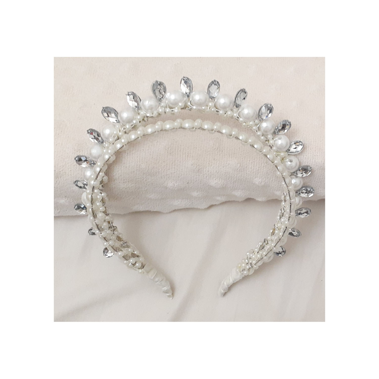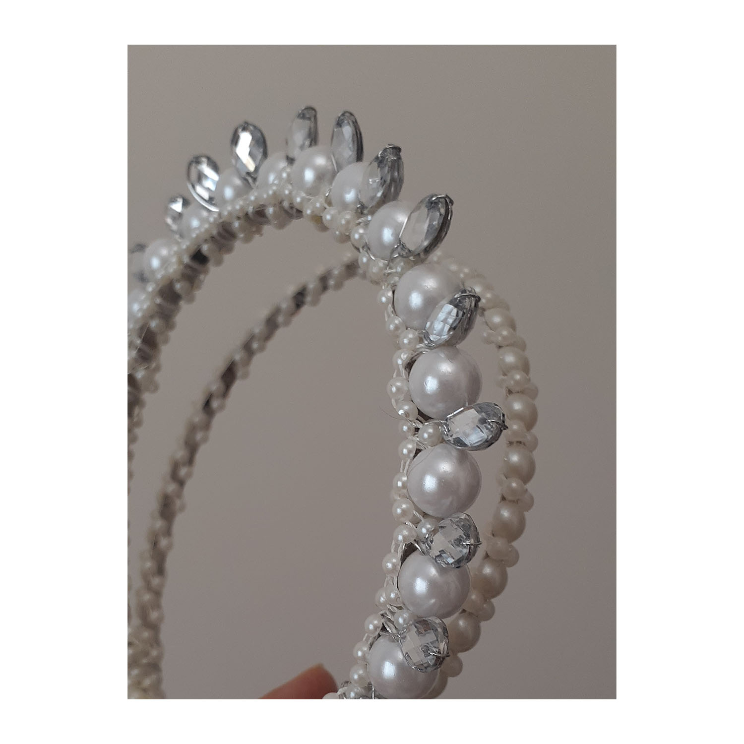 این تل مجلسی از مرواریدهای سفید مختلف وسنگ تهیه شده است و به صورت تل مجلسی دوبل می باشد با توجه به این که یک ردیف ارتفاع بیشتری دارد به صورت نیم تاج روی سر بسیار زیبا می باشد و برای تهیه آن سیم به همراه چسب ونخ نامرئی استفاده شده باعث با دوام شدن تل شده است بیشتر مناسب دختر خانم ها می باشد