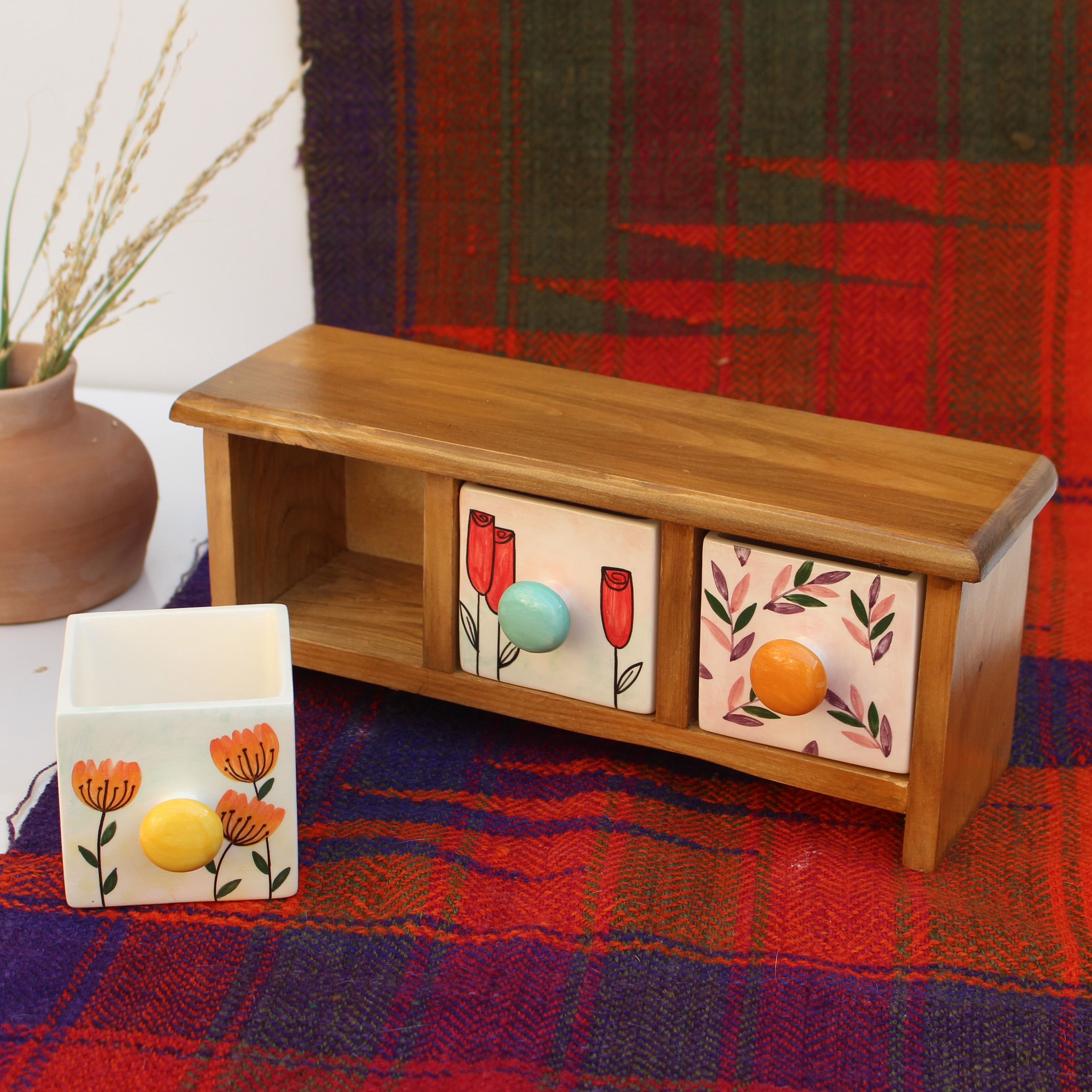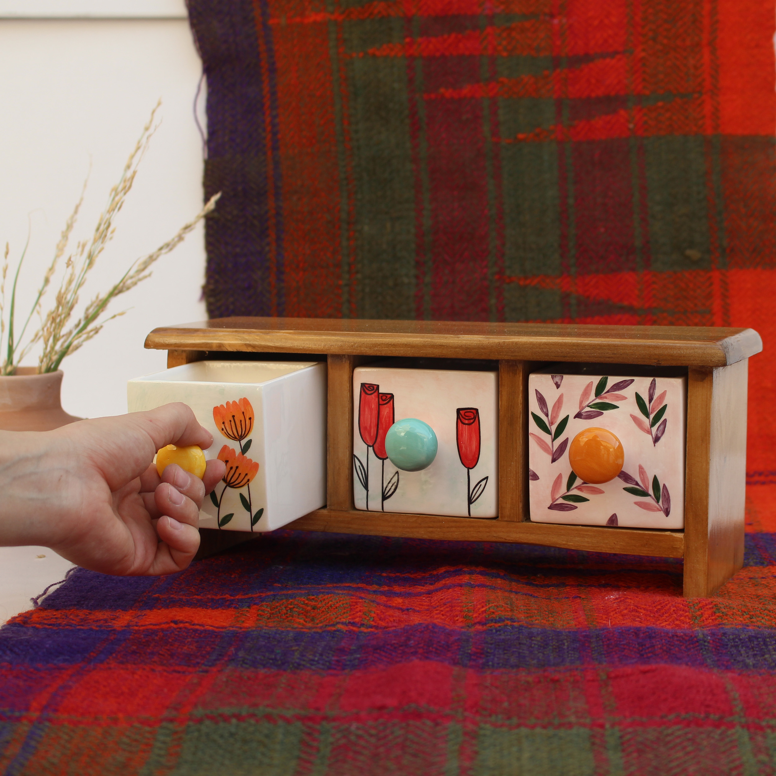 باکس چوبی پیش روی شما شامل ۳ عدد کشو سرامیکی ساخته ی دست بانوان هنرمند ایرانی که برای نظم دهی وسایل و لوازم آرایشی بهداشتی و یا نگهداری انواع ادویه جات و دمنوش و … کاربرد دارد.