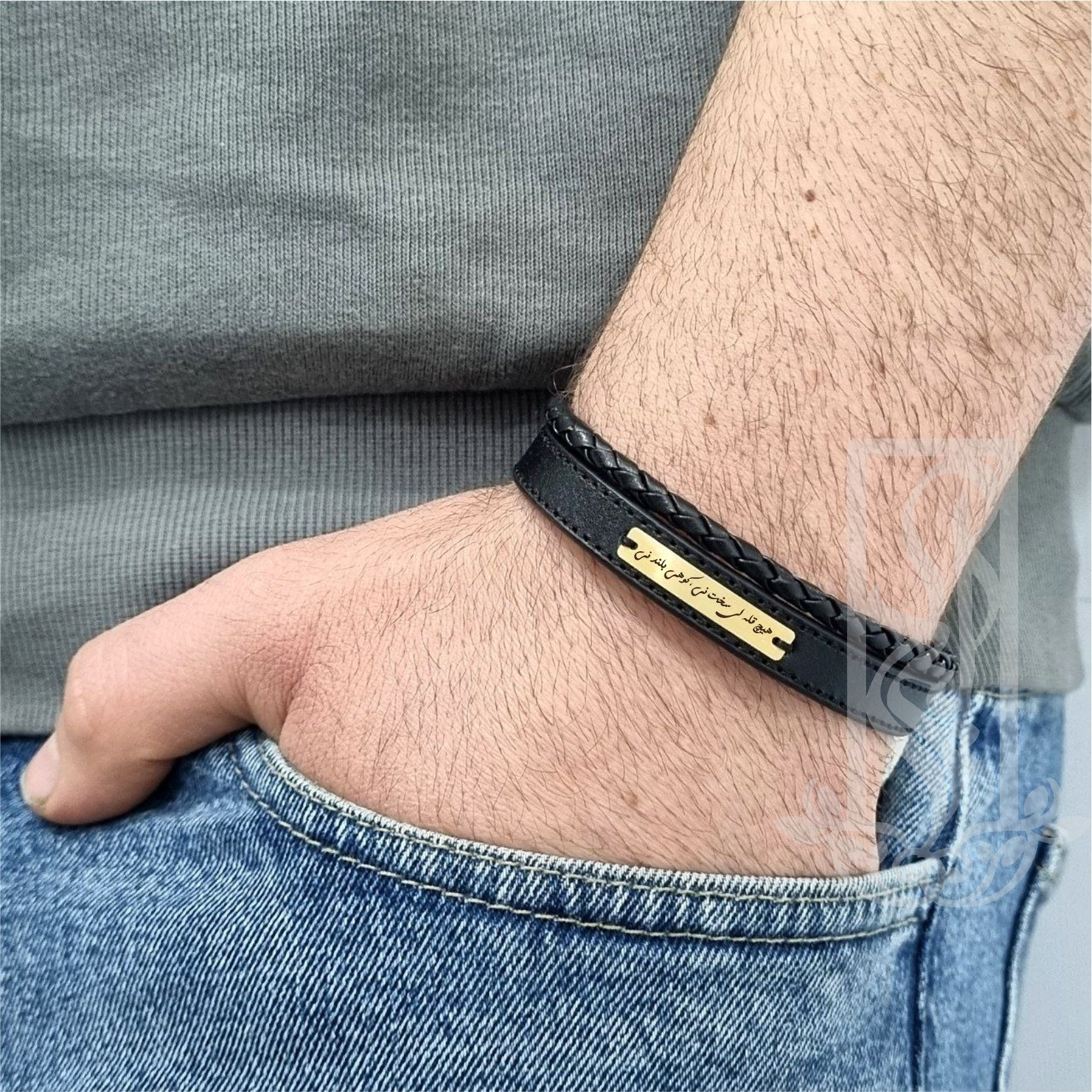 دستبند طلا و چرم با شعر (هیچ قله ای سخت نی ، کوهی بلند نی), کاری از سری اکسسوریهای شعر مردانه گروه لیردا می باشد.