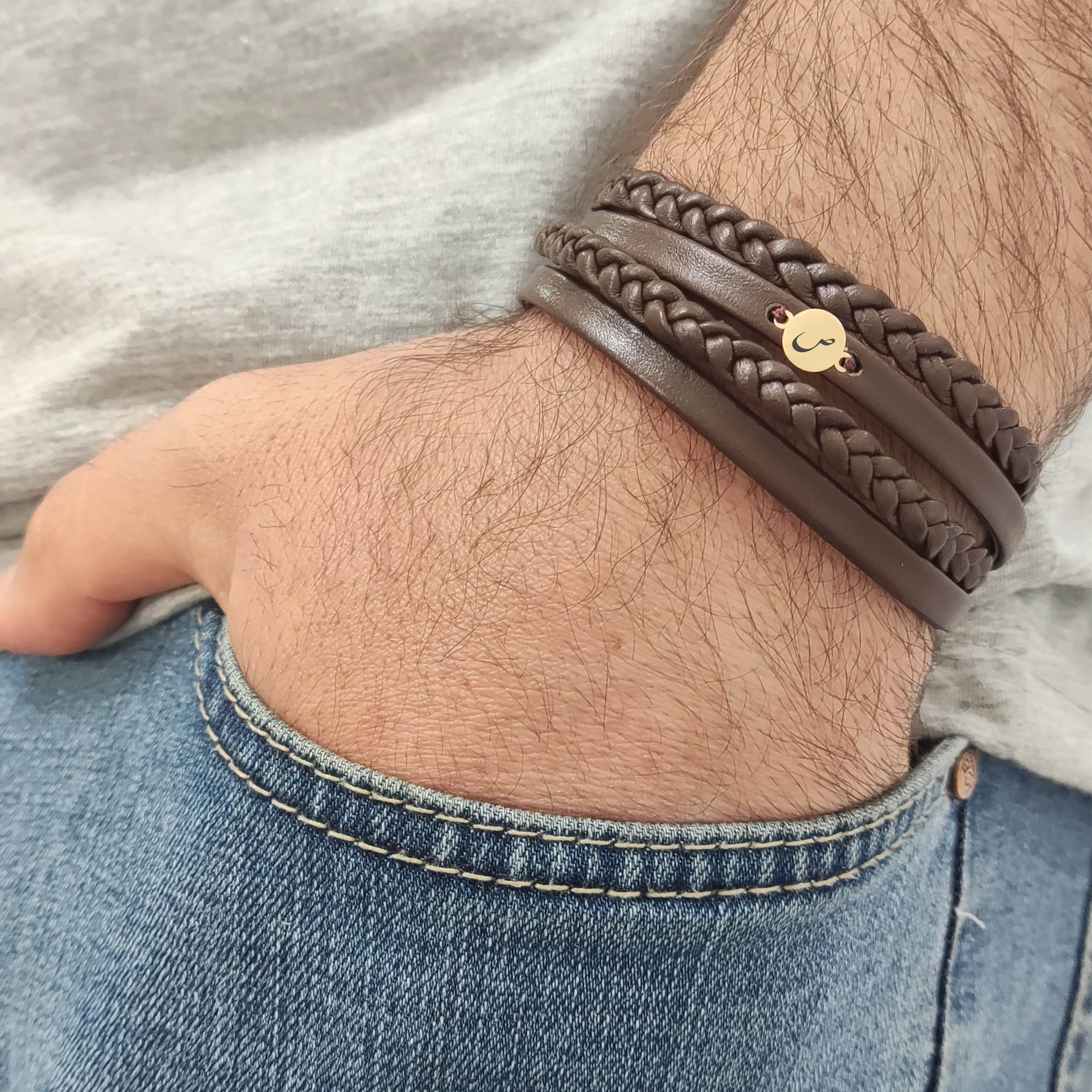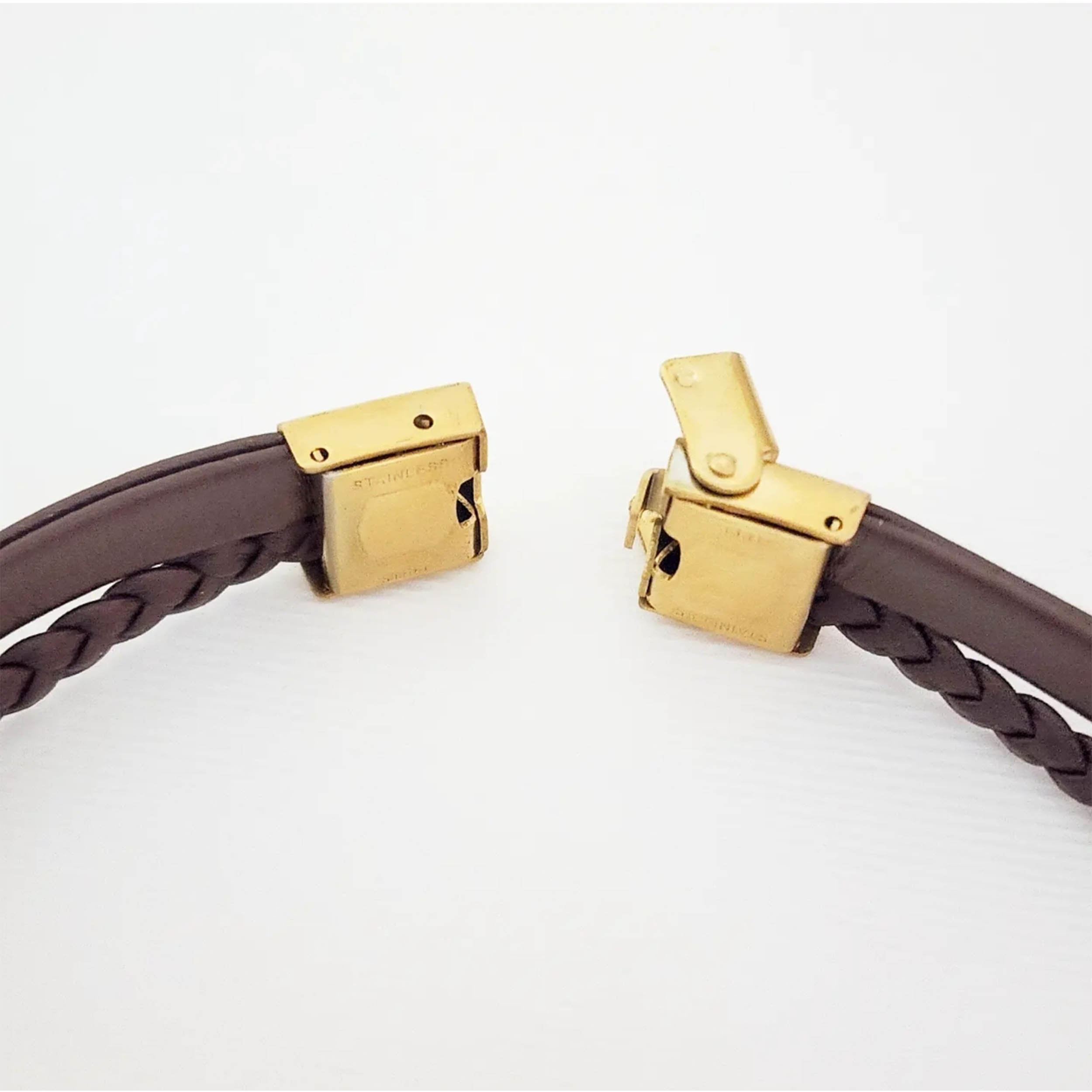 چرم بکار رفته در این دستبند، ۱۰۰ درصد طبیعی بوده و بافت آن توسط دست بافته شده. جنس قفل از استیل ضدزنگ با رنگ کاملا ثابت است. جنس پلاک روی کار، با نقره استرلینگ با عیار ۹۲۵ ساخته و روکش آن طلاست.