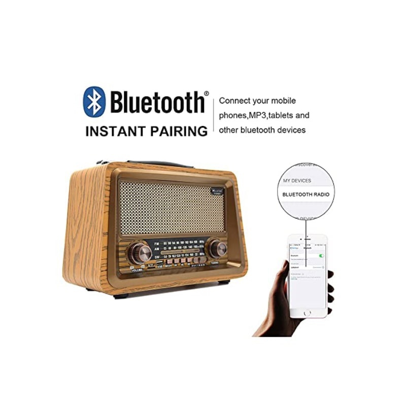 از جنس چوب و پلاستیک میباشد،دارای سه موج AM,FM,SW، ورودی USB دارد، پشتیبانی از کارت حافظه SD Card دارد، قابلیت اتصال به بلوتوث دارد، باطری داخلی قابل شارژ دارد،