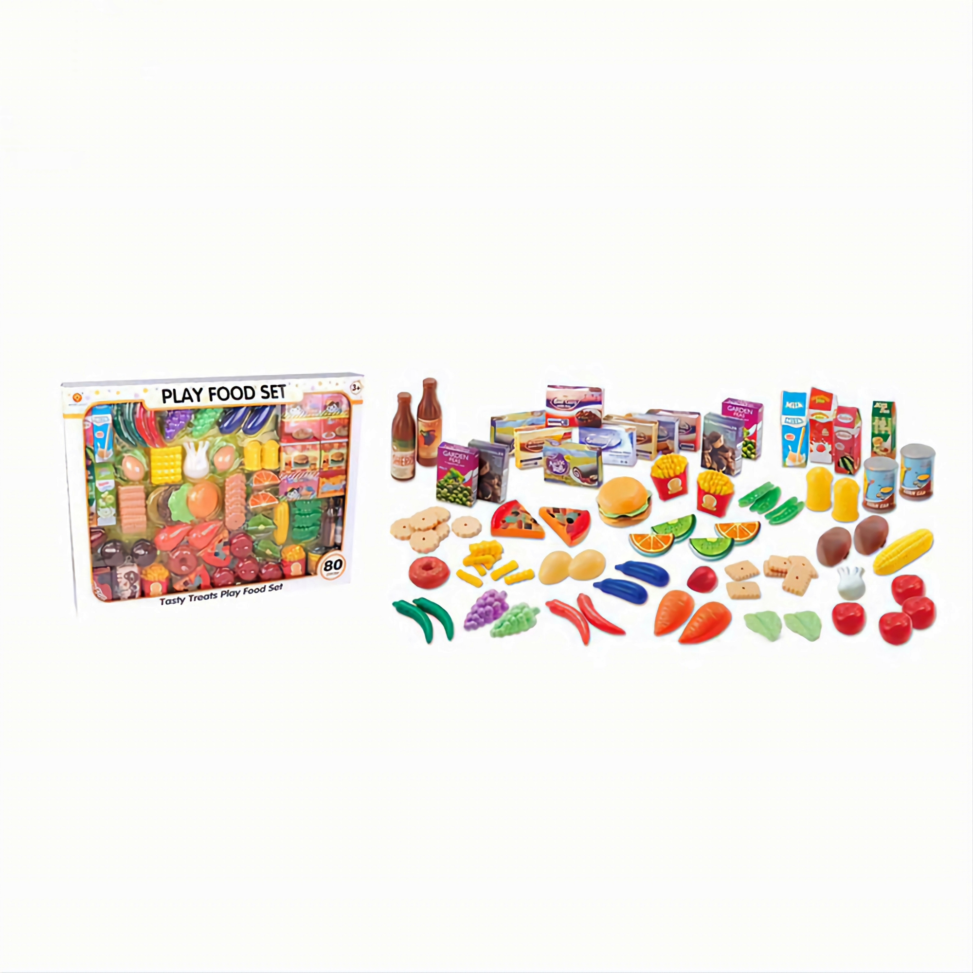 ست خوراکی کامل و بینظیر ۸۰ تکه در حقیقیت ۳ ست کامل خوراکی را در خود جای داده شامل میوه و سبزیجات و فست فود و شیرینی و پاکت های خوراکی از جمله آب میوه ی پرتقال و توت فرنگی و شیر قهوه و شیرچایی و ۲ بطری نوشیدنی و ۲ کنسرو و دو نمکدان و ۱۰ بسته ی خوراکی با عکس شکلات و آب نبات و کاپ کیک و اسنک و غیره میباشد ،قطعات این ست شامل؛ ۲ عدد انگور سبز و بنفش، ۴ عدد فلفل سبز و قرمز، ۲ عدد بادمجان، ۱عدد پیازچه توت فرنگی، ۶ عد رشته ی لوبیا سبز، ۱ عدد ذرت، ۲ اسلایس از کیوی و ۲ اسلایس از پرتقال، ۲ عدد هویج، ۲ برگ کاهو، ۴ عدد گوجه، ۲ قاش پیتزا، ۱ پک همبرگر، ۲ پاکت سیب زمینی سرخ شده به همراه چند عدد سیب زمینی خورد شده ی تکی و ۲ عدد تخم مرغ و ۱۲ عدد کوکی و بسکوییت در دو طرح و ۱ عدد پیراشکی میباشد این مجموعه برای بازیهای وانمودی برای کودکان جالب و سرگرم کننده است.