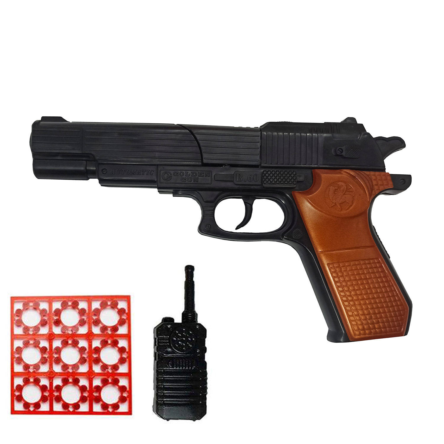 این محصول دارای تیر ترقه ای بوده که کاملا بی خطر است و میتواند شما را ساعت ها سرگرم کند نحوه مسلح کردن کاملا شبیه به نمونه واقعیست این کالا بر خلاف محصولات چینی موجود در بازار از مواد درجه یک تولید شده است که سلامت شما را حفظ می کند همراه این مجموعه بی سیم و نارنجک و ۴۵حلقه تیر ترقه ای میباشد این مجموعه دارای بسته بندی کیفی زیپ دار قابل حمل میباشد