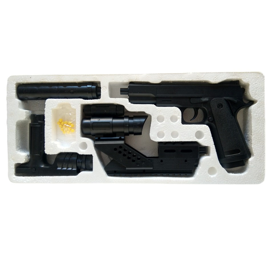 تفنگ بازی ساچمه ای لیزر دار به طول ۴۱ سانتیمتر در حالت سرهم بندی شده دارای کیفیت خوب و بسته بندی مناسب بوده و با پر کردن خشاب و کشیدن لوله آماده شلیک میشود .