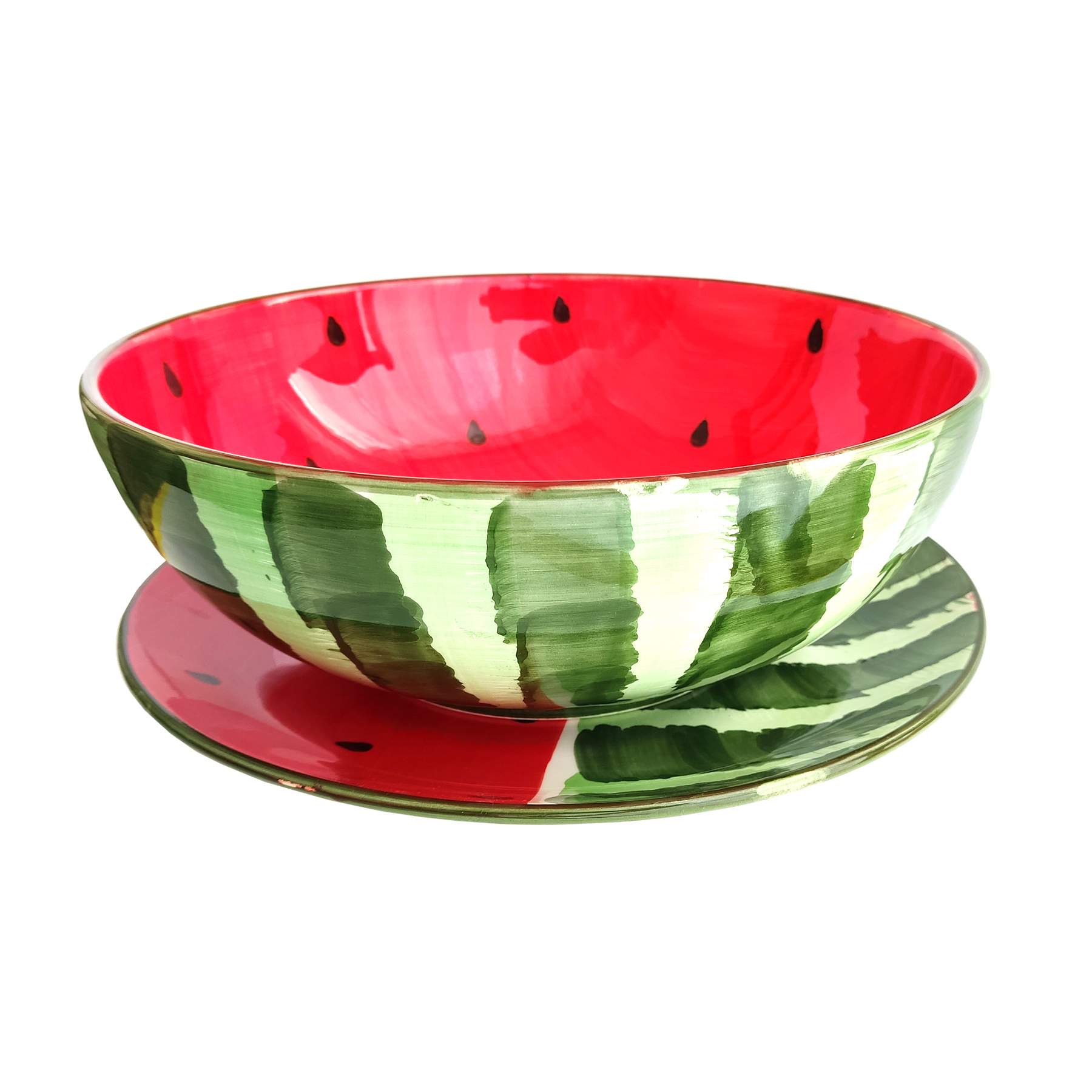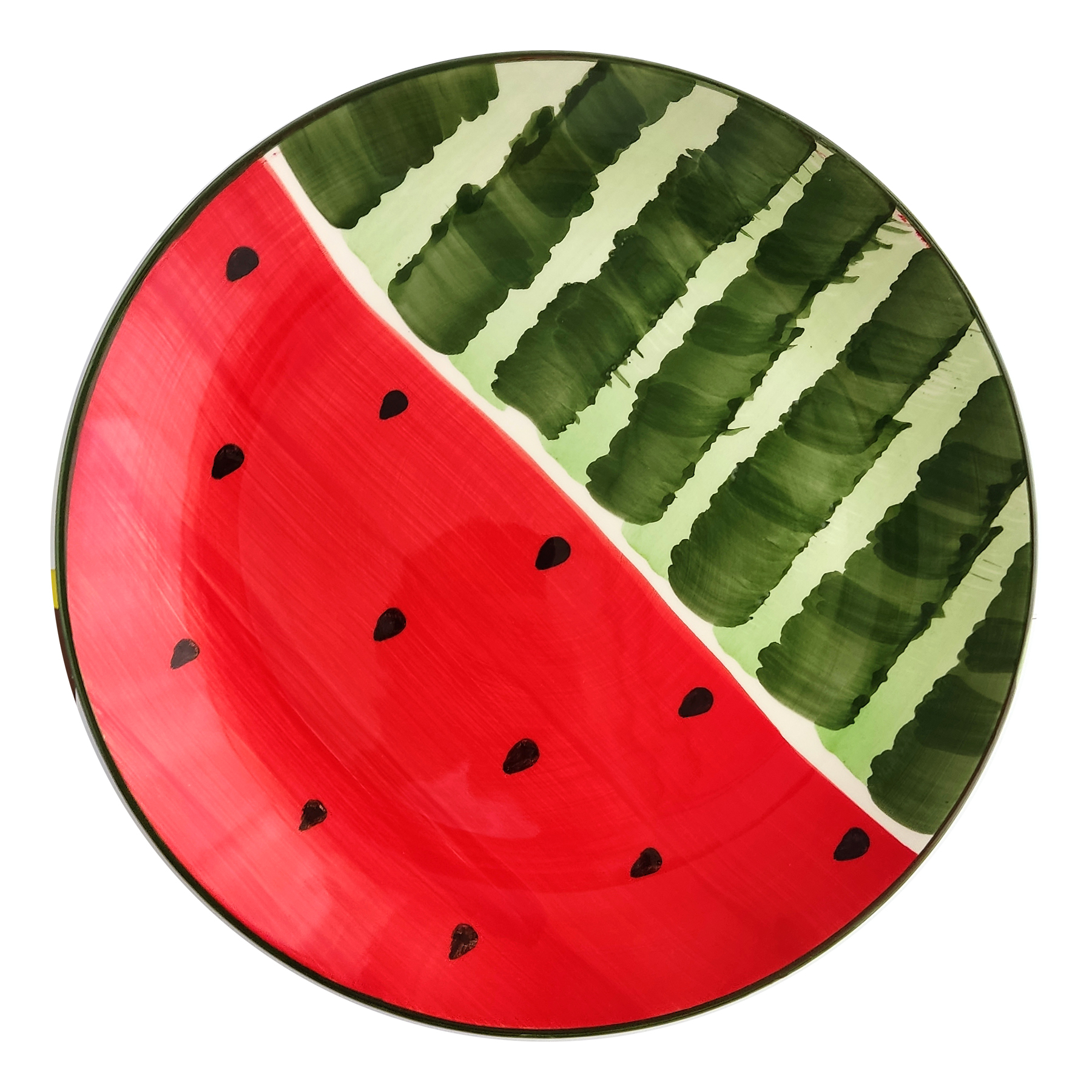 کاسه بشقاب طرح هندوانه خوری یلدایی شب چله کد ۱۴۰۲ یکی از محصولات شیک و تزئینی برای شب چله که یکی از شب های به یاد ماندنی ایرانیهاست، محسوب می شود. قطر کاسه حدود ۲۶ سانتی متر و قطر بشقاب آن حدود ۲۸ سانتی متر است. یکی از مزیت های قابل توجه این محصول طرح سفارشی و خاص آن است که توسط بلوط زرین ارائه می شود و از لعاب درجه یک و در کوره با حرارت بالا تهیه شده است که مقاومت بالایی نسبت به محصولات مشابه دارد. طرح ترسیم شده بر روی این محصول به صورت دستی و توسط هنرمندان این حوزه ترسیم شده است که به همراه رنگ لعاب اسپانیایی آن جلوه منحصربفردی به آن می بخشد؛ چیزی که با گذر زمان می تواند بر ارزش آن بیافزوید.