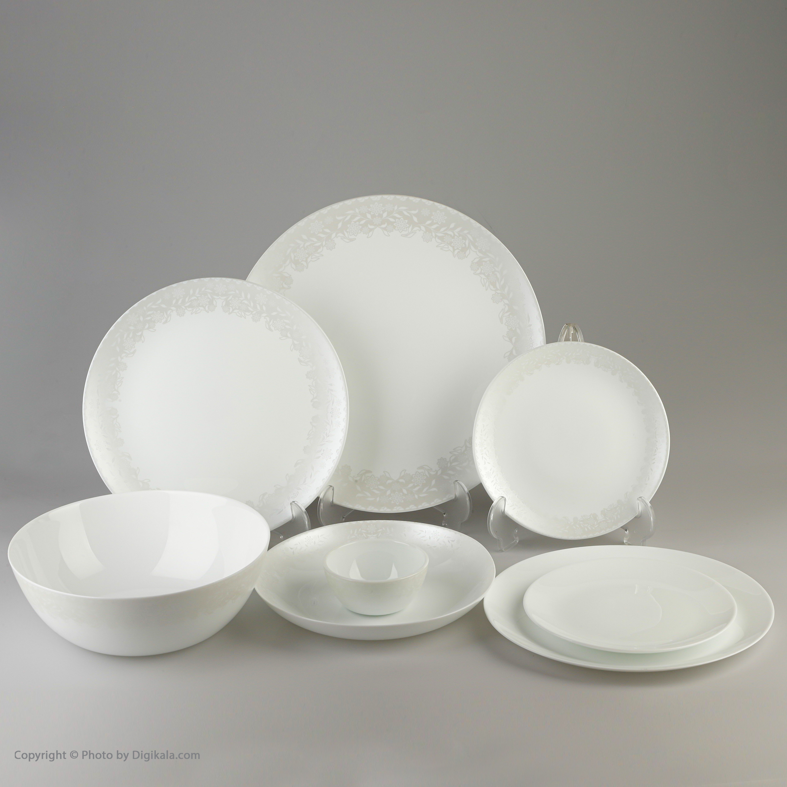 این سرویس غذاخوری شامل ۲۶ قطعه است که شامل شش عدد پیاله، شش عدد بشقاب غذا خوری، شش عدد بشقاب خورش خوری، یک ظرف سالاد خوری، شش عدد پیش دستی، یک عدد بشقاب غذا خوری و یک عدد پیش دستی اشانتیون میشود. همچنین، این سرویس دارای مزایایی نظیر مقاومت در برابر خط و خش، دوام بالا و مقاومت در برابر شستشوی مکرر است. علاوه بر این دارای قابلیت عدم جذب بو و طعم نیز هستند.