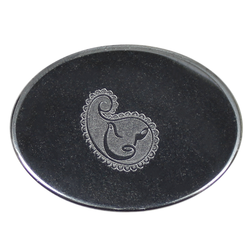 این سنگ حدید است ، با حکاکی علی مع الحق الحق مع علی که به رنگ مشکی و طلایی می باشد .