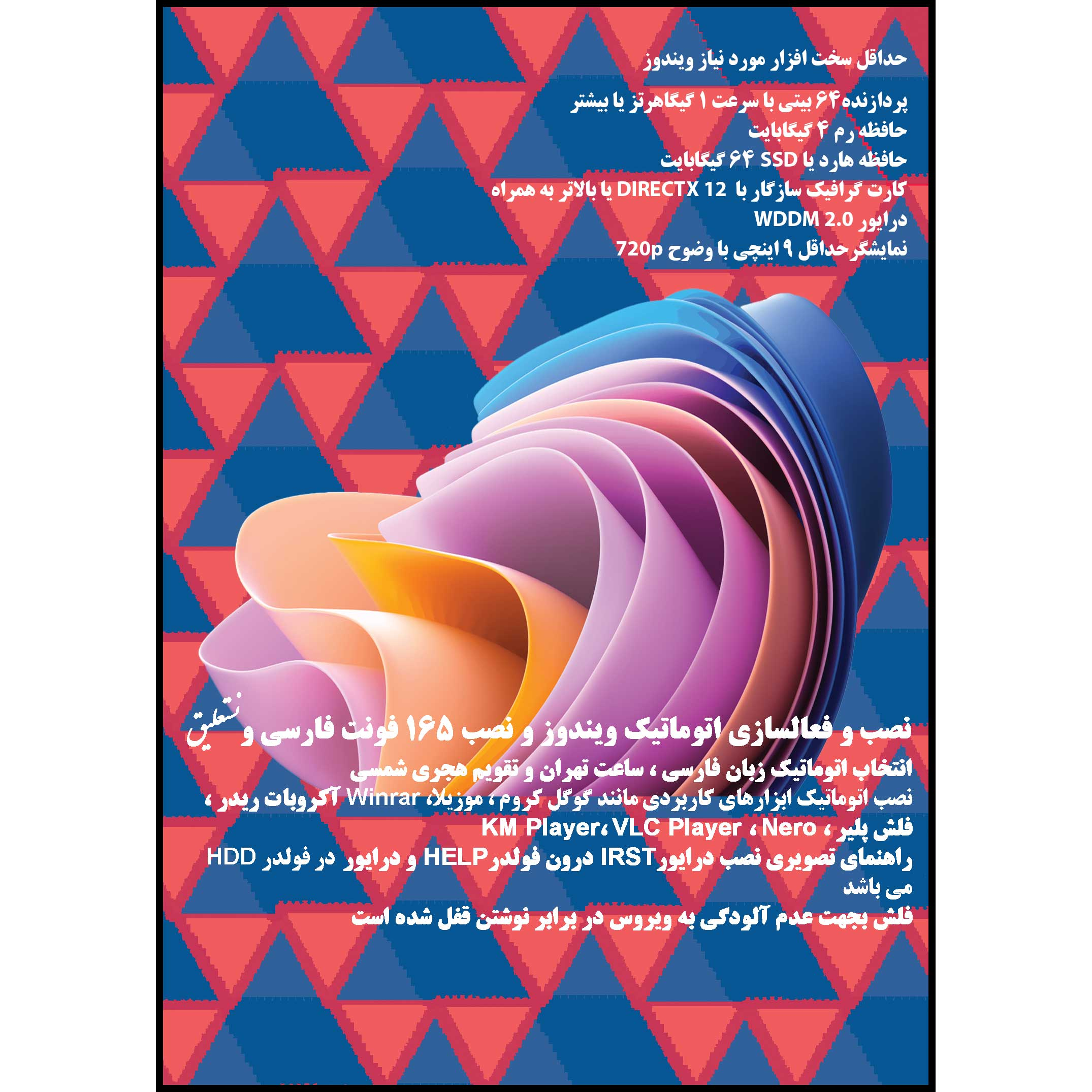 نصب سیستم عامل از روی فلش مموری بدلیل افزایش قیمت درایوهای نوری ( DVD ) رایترها، رواج بیشتری یافته اند. علاوه بر آن ظرفیت بیشتر فلش مموریها این امکان را فراهم کرده تا بتوان نرم افزارها و سیستم عاملهای بیشتر و کاربردی تری روی آن ذخیره نمود. این فلش مموری بوتیبل با بوت UEFI مناسب سیستمهای جدیدتر و با پارتیشنهای GPT میباشد. فلش مموری بوتیبل ویندوز با نصب اتوماتیک ویندوز تهیه شده که محصول ۲۰۲۳ بوده و حاوی آخرین آپدیت ویندوز می باشد تا پس از نصب آن تا مدتها نیازی به آپدیت و صرف زمان و حجم اینترنت مصرفی نخواهید بود. شما حین نصب نیازی به توجه به سیستم نداشته و می توانید به کارهای دیگر خود برسید و منتظر دیدن دسکتاپ ویندوز شوید. پس از نصب متوجه خواهید شد فونتهای فارسی نصب شده و تمامی تنظیمات زبان فارسی از جمله انتخاب تقویم شمسی و کیبرد فارسی انجام شده اند. برخی نرم افزارهای کاربردی از جمله گوگل کروم،موزیلا، آکروبات ریدر، WinRAR،فلش پلیر،KMPlayer، VLC Player، NERO، NITRO pro در مرحله آخر نصب می شوند.