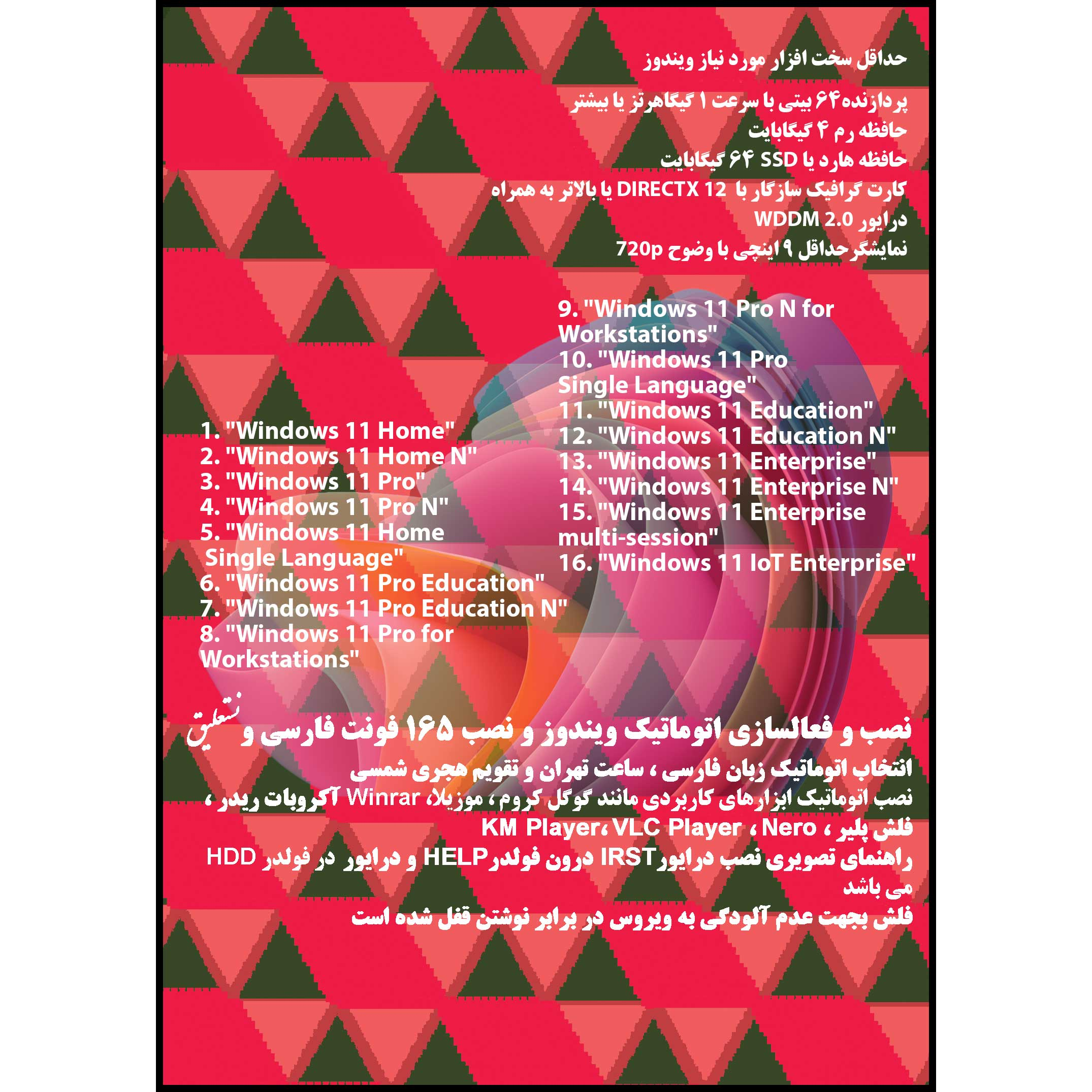 نصب سیستم عامل از روی فلش مموری بدلیل افزایش قیمت درایوهای نوری ( DVD ) رایترها، رواج بیشتری یافته اند. علاوه بر آن ظرفیت بیشتر فلش مموریها این امکان را فراهم کرده تا بتوان نرم افزارها و سیستم عاملهای بیشتر و کاربردی تری روی آن ذخیره نمود. این فلش مموری بوتیبل با بوت UEFI مناسب سیستمهای جدیدتر و با پارتیشنهای GPT میباشد. فلش مموری بوتیبل ویندوز با نصب اتوماتیک ویندوز تهیه شده که محصول ۲۰۲۳ بوده و حاوی آخرین آپدیت ویندوز می باشد تا پس از نصب آن تا مدتها نیازی به آپدیت و صرف زمان و حجم اینترنت مصرفی نخواهید بود. شما حین نصب نیازی به توجه به سیستم نداشته و می توانید به کارهای دیگر خود برسید و منتظر دیدن دسکتاپ ویندوز شوید. پس از نصب متوجه خواهید شد فونتهای فارسی نصب شده و تمامی تنظیمات زبان فارسی از جمله انتخاب تقویم شمسی و کیبرد فارسی انجام شده اند. برخی نرم افزارهای کاربردی از جمله گوگل کروم،موزیلا، آکروبات ریدر، WinRAR،فلش پلیر،KMPlayer، VLC Player، NERO، NITRO pro در مرحله آخر نصب می شوند.