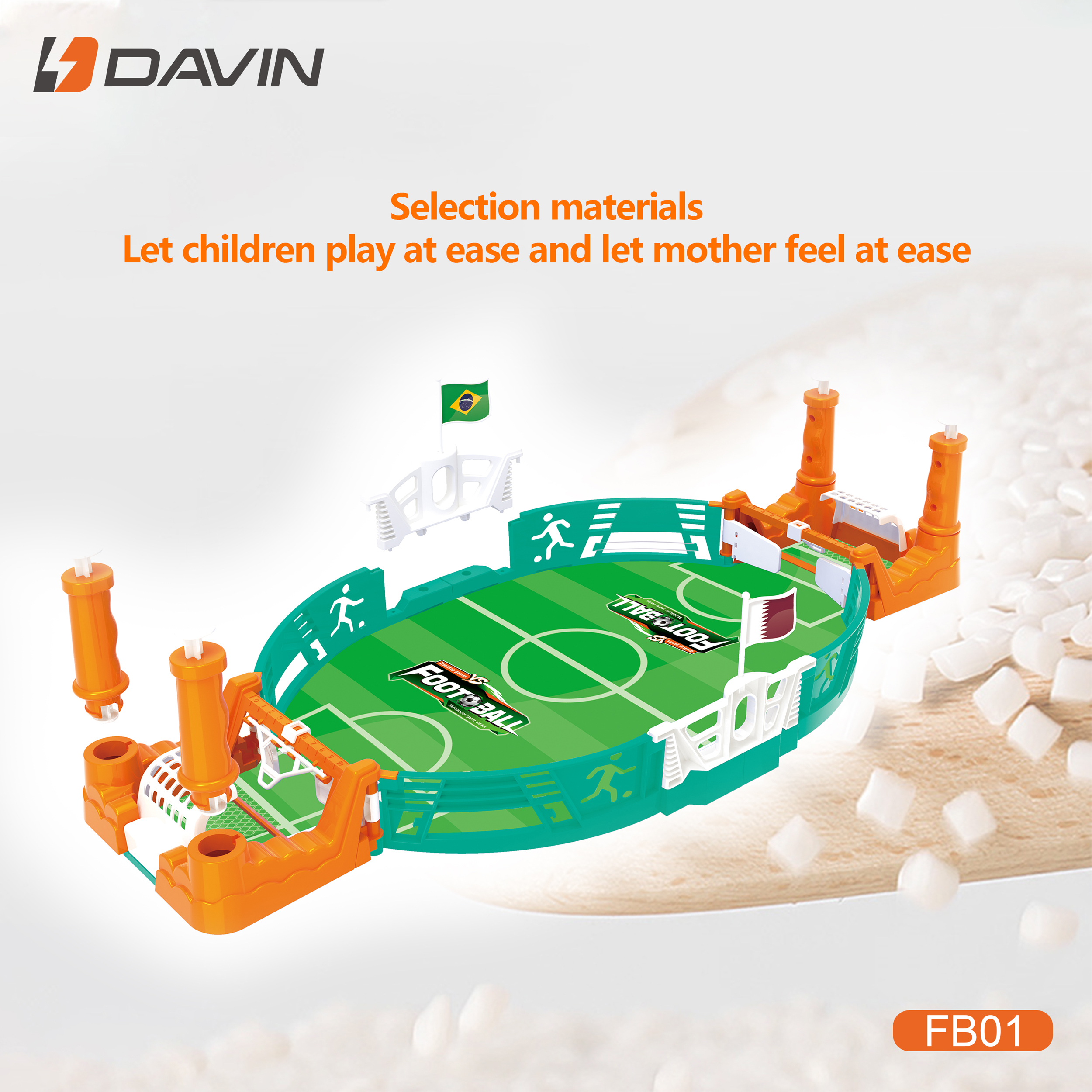 زمین فوتبال دستی محصولی از برند داوین است که کیفیت بالایی دارد. این محصول یک زمین فوتبال دستی با دو دروازه و دسته است. این بازی به صورت دو نفره یا چهار نفره انجام می شود به این صورت که دو نفر (هر نفر دو دسته ) یا چهار نفر (هر نفر یک دسته ) در دو طرف آن قرار گرفته و با استفاده از دسته ها و کلید روی آن ها توپ را به سمت زمین حریف شوت می کنند. این زمین از جنس پلاستیک با کیفیت ساخته شده و فاقد مواد مضر برای کودکان است. با زدن دکمه روی دسته، شوتر های جلوی دروازه باز شده و توپ را به سمت دیگر شوت می کنند. همچنین دارای ۴ توپ است که بعد از اوت شدن هر توپ می توان توپ دیگری را استفاده نمود. در پایان هر کسی که گل بیشتری بزند برنده خواهد بود.