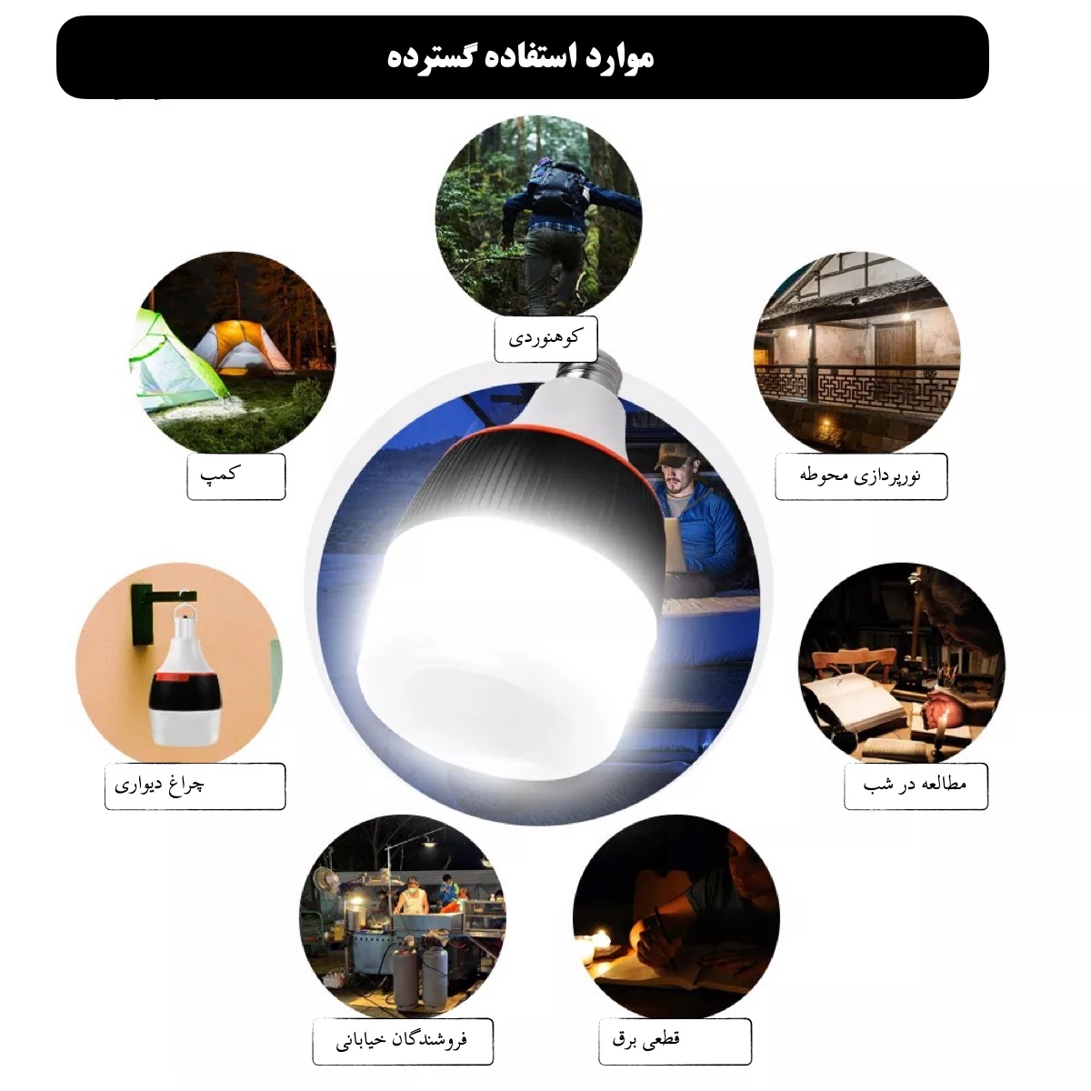 پیشنهاد میکنم یک پاوربانک بگیرید با لامپ که به usb بخوره؛ مدلهای زیادی ازش تو سایت شما هست