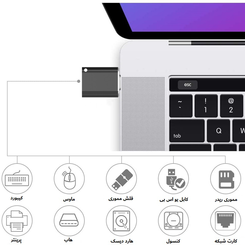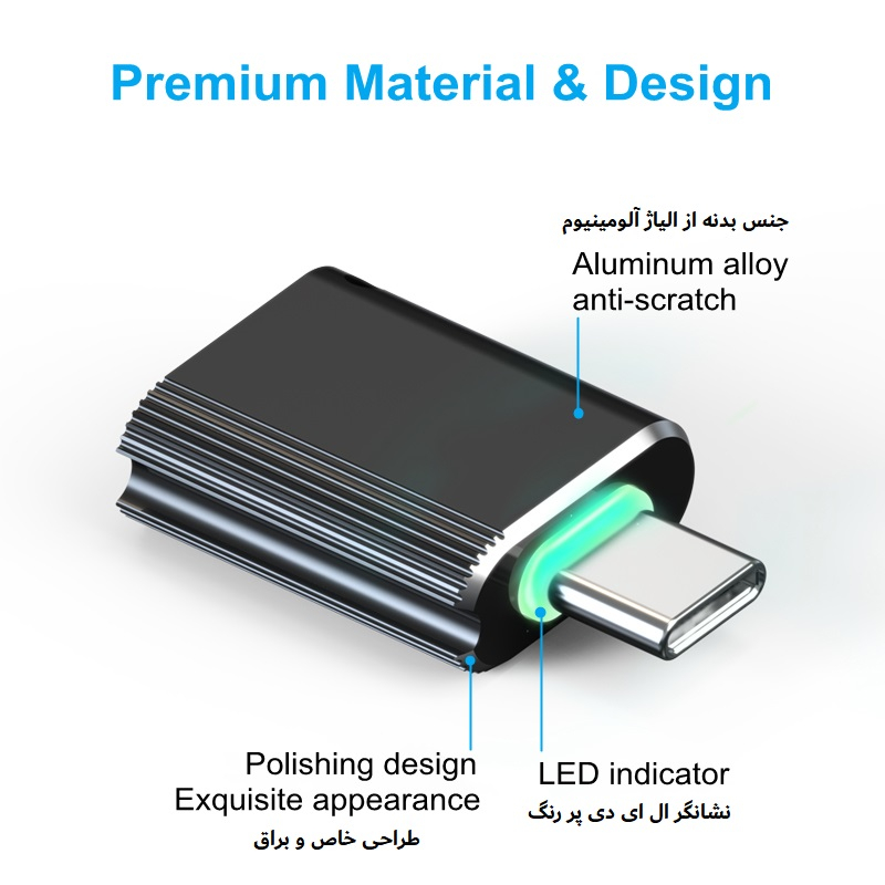 مبدل شیک و کارآمد ، با بدنه لوکس و مستحکم آلومینیومی و سرعت انتقال اطلاعات بالا، نیاز شما به انتقال اطلاعات و یا شارژ تلفن همراه تان کاملا برطرف میکند. پورت نری این مبدل به چراغ سبزرنگ زیبا مجهز است که هم در شب و هم در روز، زیبایی منحصر به فردی دارد. این مبدل، همچنین، امکان اتصال به کامپیوتر و یا آداپتور ، فلش مموری، هارد اکسترنال، کنسول، پرینتر، و پاوربانک دارای پورت TYPE-C را نیز پشتیبانی میکند. این ابزار، همراهی کارا و هدیه ای خوش قیمت برای عزیزان تان میباشد. لازم به ذکر است، جهت کار با این مبدل، دستگاه تلفن همراه شما حتما باید از قابلیت OTG پشتیبانی کند (اکثر اسمارتفون های امروزی این قابلیت را دارند) و همچنین، برای استفاده از قابلیت پرینتر و کارت شبکه، قابلیت اتصال به این دستگاهها را داشته باشد. سرعت انتقال اطلاعات این مبدل، بسته به پورت میزبان،تا ۵ گیگابیت بر ثانیه افزایش میبابد.