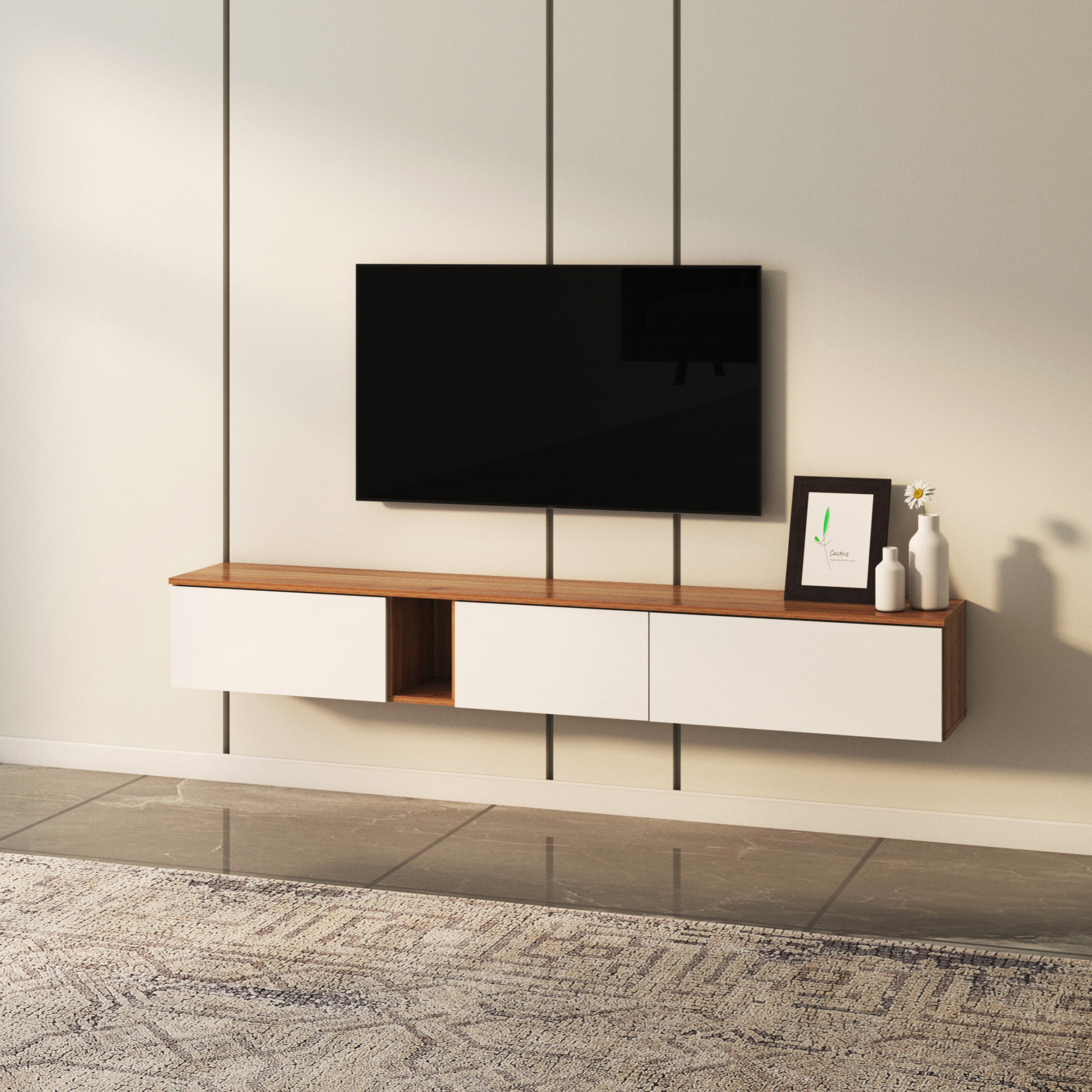 میز تلوزیون دیواری با طراحی مدرن طراحی و با بهترین متریال تهیه میشود و با ارتفاع دلخواه به صورت فیتینگ و مخفی روی دیوار نصب میگردد ، دربهای ان با فشار انگشت با استفاده از مگنت باز و بسته میشود .