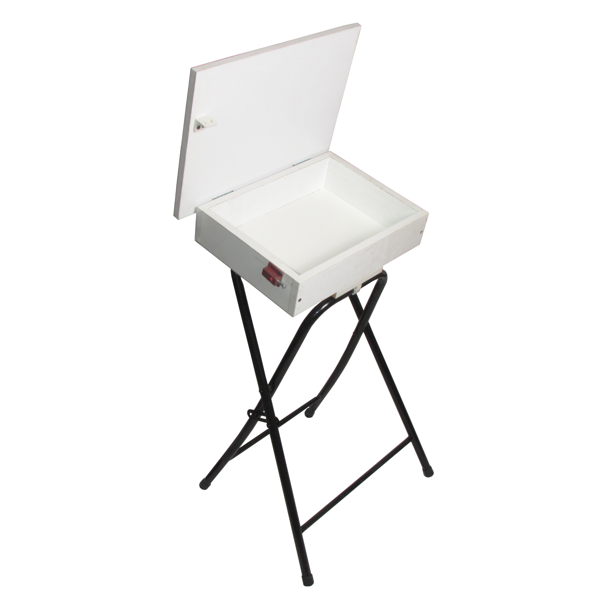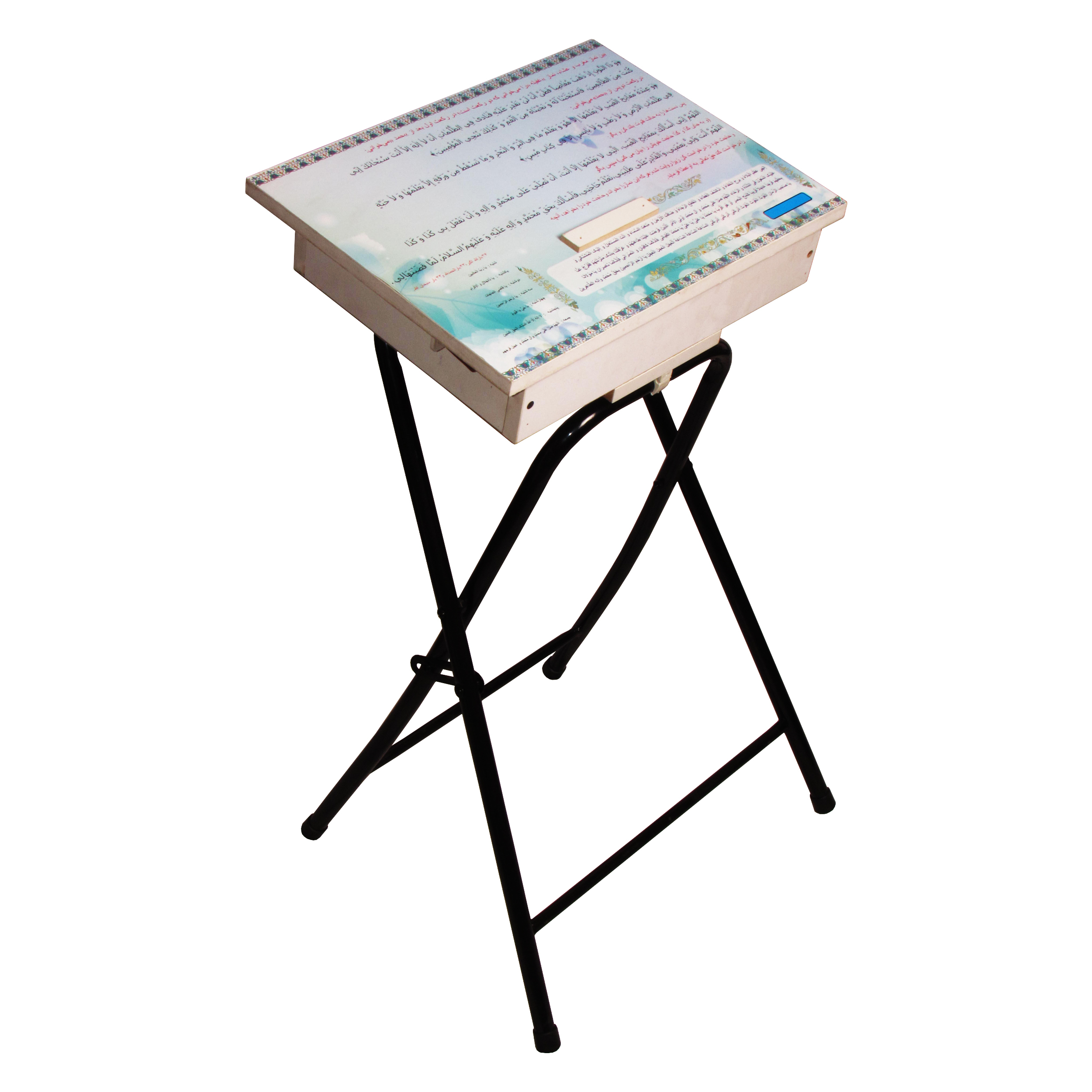 روی صفحه این میز نماز ، متن نماز غفیله ، دعای فرج امام زمان (علیه السلام) ، اذکار ایام هفته و تسبیحات حضرت زهرا (علیها السلام) چاپ شده است. به علت داشتن روکش سلفونی روی صفحه این میز دست کشیدن بدون وضو روی متن ها اشکالی ندارد. این میز نماز باکسدار می باشد و فضای ۳۵ در ۲۵ در ۸ سانتیمتر زیر میز قرار داده شده تا قرآن، مفاتیح، چادر، مهر و سجاده در آن جا بگیرد و از پراکندگی و جاگیری و فاصله افتادن از لوازم عبادت، دوری شود و همه ی لوازم سریع و ساده در دسترس باشد. هم میز و هم صندلی این مجموعه تاشو می باشد و به هنگام باز شدن در ۹۵x45x95 سانتیمتر و به هنگام جمع شدن ۲۵x45x89 سانتیمتر فضا اشغال می کند و به راحتی میتوان در گوشه ای از منزل برای همیشه قرار داده شود و کمتر از نیم متر مربع فضا برای آن کافیست. این میز نماز قابلیت تنظیم در دو حالت شیب را دارد و تاشو و قابل حمل آسان و با مقاومت بسیار بالا و تحمل وزن ۱۰۰ کیلو گرم و بالاتر می باشد و به علت وزن کم آن به راحتی قابل جابجایی می باشد و به علت تاشو بودن حتی در سفر نیز قابل استفاده و جابجایی می باشد. پایه ها از جنس لوله آهنی بسیار مقاوم با تحمل وزن بالاست. صفحه این میز از جنس نئوپان ملامینه ضدخش و نوار PVC با بالاترین کیفیت می باشد. این محصول تماما ایرانی و با بالاترین کیفیت می باشد. ویژگی این محصول کم جا بودن و تاشدن در هنگام عدم نیاز است. موارد استفاده این میز مطالعه، صندلی نماز اداری می باشد. دیگر ویژگی ها سبک و قابل حمل آسان، قابلیت استفاده تمام سنین، تحمل وزن بالای پایه، پرکاربرد بودن است.