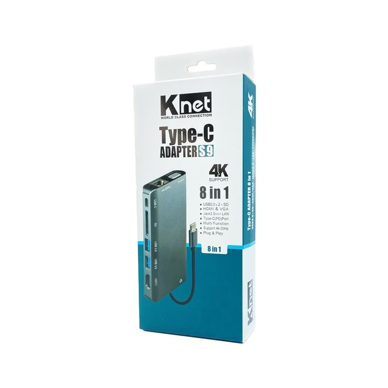 با توجه به اینکه امروزه بر روی بسیاری از لپ تاپها از درگاه Type-c استفاده میشود، استفاده از این هاب که درگاه Type-c لپ تاپ شما را به ۸ درگاه کاربردی دیگر تبدیل میکند، انتخاب بسیار مناسبی است.هاب ۸ پورت کی نت قابلیت اتصال از طریق پورت تایپ سی به انواع نوتبوک و مکبوک را دارا میباشد.شما از طریق این هاب میتوانید دستگاه خود را شارژ نمایید.این محصول دارای ۲ عدد USB(3) خروجی HDMI پورت LAN 10-100-1000 و ۱ عدد کارت ریدر میباشداین هاب Type-c دارای ۸ پورت گوناگون شامل پورت HDMI، دو پورت USB، پورت USB Type-c، یک پورت اترنت، یک درگاه ۳.۵ میلی متری یا همان AUX و درگاه مموری ریدر دوگانه از نوع SD و TF است. مجموعه این پورتها روی این هاب زیبا و شکیل، این هاب را به یکی از ضروریترین دستگاههای جانبی پر استفاده تبدیل کرده است. ظاهر این مبدل چندکاره دارای حجم استاندارد است و روی میز کار نیز ظاهری دلچسب دارد. درگاه USB 3.0 روی این هاب میتواند با سرعت حداکثر ۶۰۰ مگابایت بر ثانیه اطلاعات را از روی تلفن همراه یا فلش مموری شما جابهجا کند. همچنین این پورتها قابلیت شارژ کردن تلفن همراه را با توان ۱۰۰وات (۲۰A/5V) دارد. پورت اترنت این هاب از نوع گیگابیت است و توانایی متصل کردن رایانه و لپتاپ شما را به اینترنت از طریق کابل شبکه دارد. با پورت های TF و SD تعبیه شده روی این هاب میتوانید انواع اطلاعات روی کارت حافظههای خود را جابهجا نمایید و به اطلاعات آنها دسترسی پیدا بکنید پورت HDMI نیز بر روی این هاب قرار گرفته که از روزولوشن بسیار بالای ۴K پشتیبانی میکند. به کمک این هاب و پورت HDMI و VGA که روی آن قرار گرفته، به راحتی میتوانید تصویر لپ تاپ خود را روی تلویزیون و یا نمایشگر خود مشاهده کرده و از کیفیتی بسیار بالا لذت ببرید.