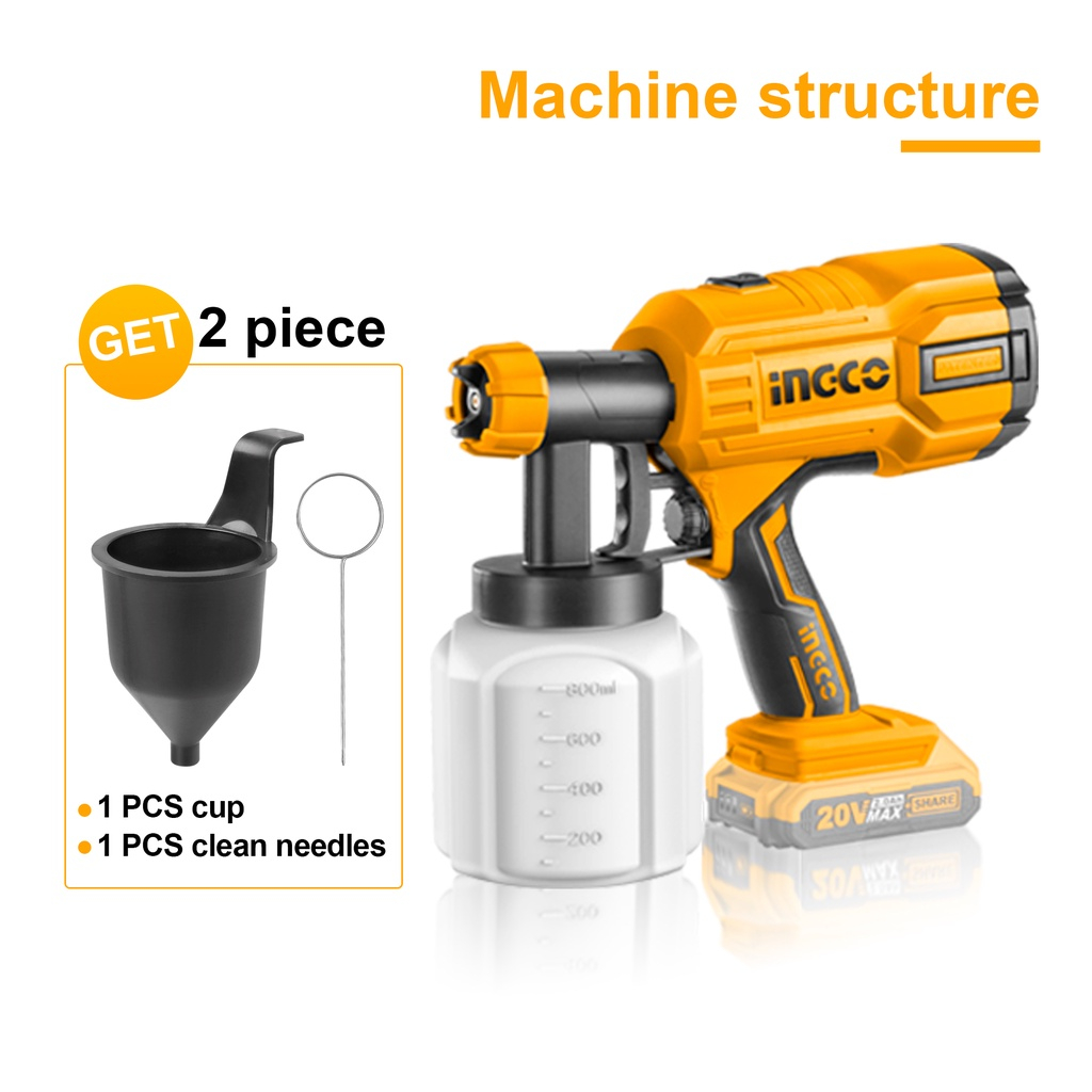 پیستوله رنگ پاش شارژی اینکو مدل CSGLI2001، این دستگاه بدون باتری و شارژر عرضه میگردد و دارای مخزن ۸۰۰ میلی متری جهت رنگ آمیزی صنعتی دقیق و ظریف ماشین آلات و خودرو، محیط های داخلی و خارجی ساختمان ها، توسط شرکت معتبر اینکو طراحی و ساخته شده است، مزیت این پیستوله شارژی نسبت به پیستوله های دیگر، قابلیت جابه جایی آسان در محیط کار بدون نیاز به کمپرسور است و کاربر برای رنگ آمیزی به راحتی به هر مکانی دسترسی خواهد داشت، توجه داشته باشید این دستگاه بدون باتری و شارژر ارائه شده است، اما شما با خرید یک بار باتری و شارژر اینکو می توانید از ۱۰۰ ابزار شارژی این شرکت به صورت مشترک استفاده نمایید، لینک خرید باتری و شارژر این دستگاه در پایین صفحه موجود می باشد.