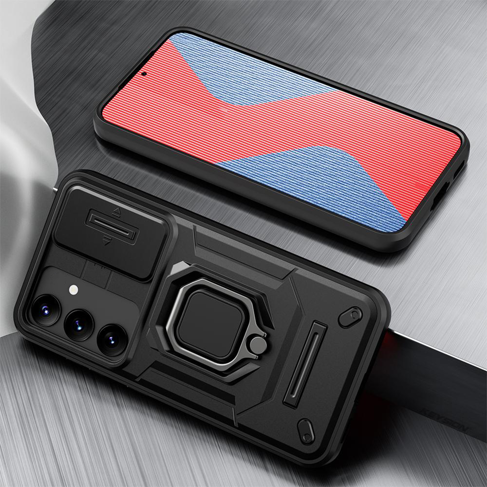 کاور جدید سامورایی سری Shockproof به گونه ای طراحی شده است که همه لبه های آن، با ارتفاع قابل توجهی گوشی را در بر گرفته و مانع از آسیب دیدن گوشی سامسونگ Galaxy A54 / A54 5G شود. گرچه این قاب با لبه های ژله ای هر چهار طرف گوشی را پوشانده است، اما به دلیل انعطاف پذیری لبه ها، کاربران برای نصب و جداسازی این قاب روی گوشی زحمتی نخواهند داشت و فشاری به گوشی وارد نمی شود. ژله ای بودن دور کاور باعث میشد در صورت سقوط گوشی روی زمین شوک ناشی از ضربه در همه زوایای کاور پخش شده و آسیبی به گوشی وارد نشود. یکی از مهمترین ویژگی های این قاب وجود حلقه نگهدارنده در پشت قاب است که شما میتوانید از حلقه ای که به این قاب متصل است در موارد گوناگون استفاده کنید. برای نمونه: با قرار دادن انگشت دورن حلقه، گوشی سامسونگ Galaxy A54 / A54 5G کاملا در دست محکم می شود و احتمال افتادن گوشی از دست از بین میبرد. یا میتوانید با چرخاندن حلقه کاور را به حالت استند در بیاورید و به تماشای فیلم بپردازید. همچنین این حلقه نگهدارنده با داشتن حالت آهن ربایی می تواند به خوبی روی هولدرهای آهنربایی داخل خودرو بچسبد و دیگر نیازی به استفاده از برچسبهای آهن ربایی مجزا نخواهید داشت. این قاب دارای یک اسلاید کشویی است که به خوبی از دوربین محافظت می کند. همچنین در اطراف لنز های دوربین مقداری برجستگی وجود دارد که می تواند از دوربین گوشی هنگام ضربه محافظت کند.