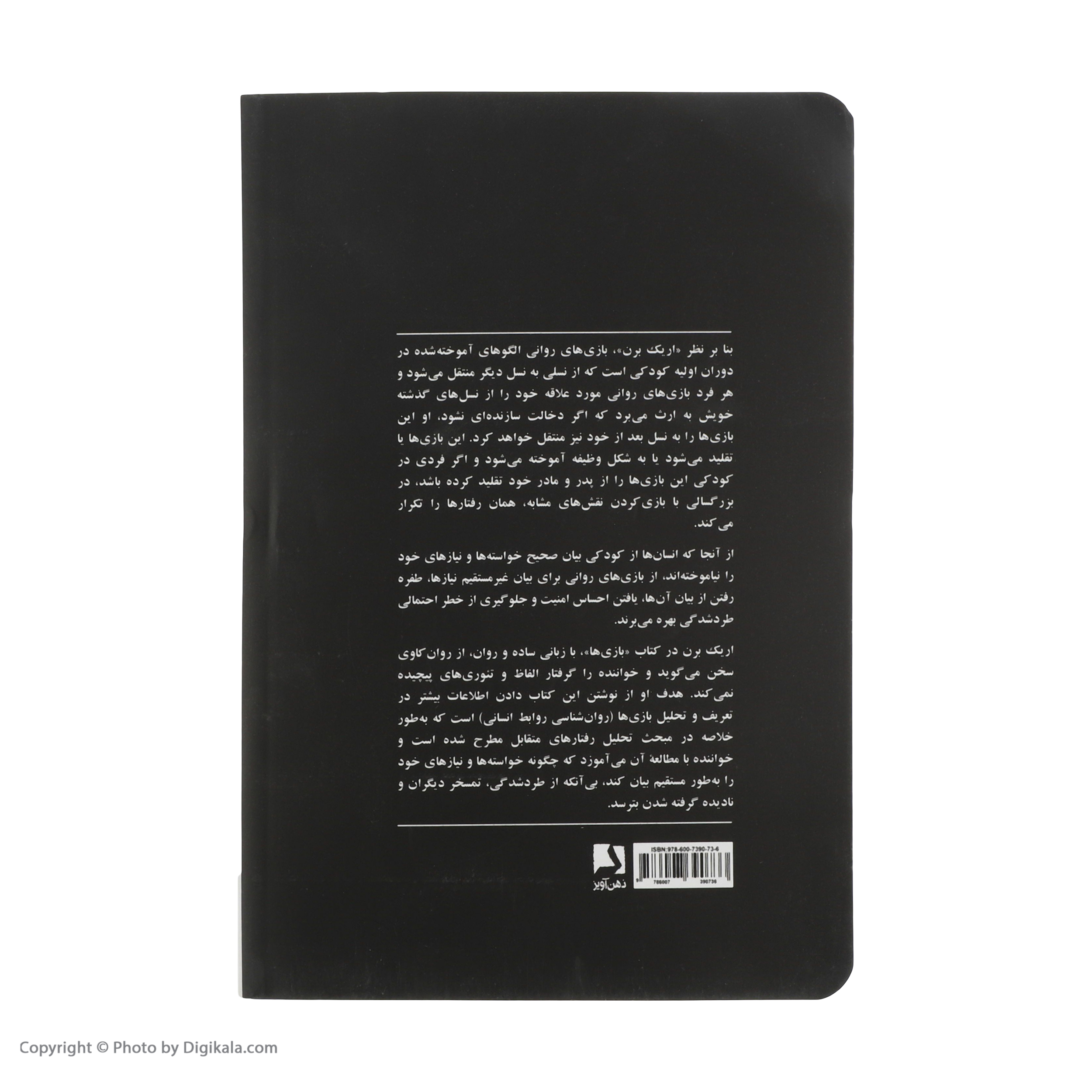 کتاب «بازی ها» نوشته ی «اریک برن» و ترجمهی «اسماعیل فصیح» است. «تحلیل ساخت»، «تحلیل تبادل»، «رویه ها و مناسک»، «وقت گذارنیها»، «بازیها» عنوان برخی از بخش های کتاب است. قسمتی از کتاب به این صورت است: «کودک، بالغ و والد "کودک" درون همان بخش از وجود ماست که دوست دارد کودکی کند؛ درست مثل یک بچه سرزنده و با هیجان باشد. خلاقیت، شور و شوق، احساسات تند و تیز، قهر و آشتی، ترس، وحشت، عشق و تنفر همه و همه از کودک درون ما منشا می گیرد. "بالغ" بخش عاقل شخصیت ماست؛ بخشی که تصمیمهای منطقی میگیرد، اطلاعات را پردازش میکند، با دیگران رابطه محترمانه برقرار میکند و کلا واقع گراست. "والد" درون که منفور ترین بخش شخصیت ما را از نظر اریک برن تشکیل میدهد همان باید و نبایدهای بدون منطق و دلیل ماست. همان دستور العملهای بی چون و چرایی که سالهاست برای خود ساختهایم و حتی اطرافیانمان را هم با آن اسیر کردهایم. اما اریک برن والد را نیز دو نوع میداند اولی والدی سختگیر و آزار دهنده و دومی والدی نوازشگر و تاییدکننده و اعتقاد دارد والد بد و مایوس کننده والد نوع اول است و بهتر است به نوع دوم تغییر کند.» کتاب حاضر را انتشارات «ذهن آویز» منتشر کرده است.