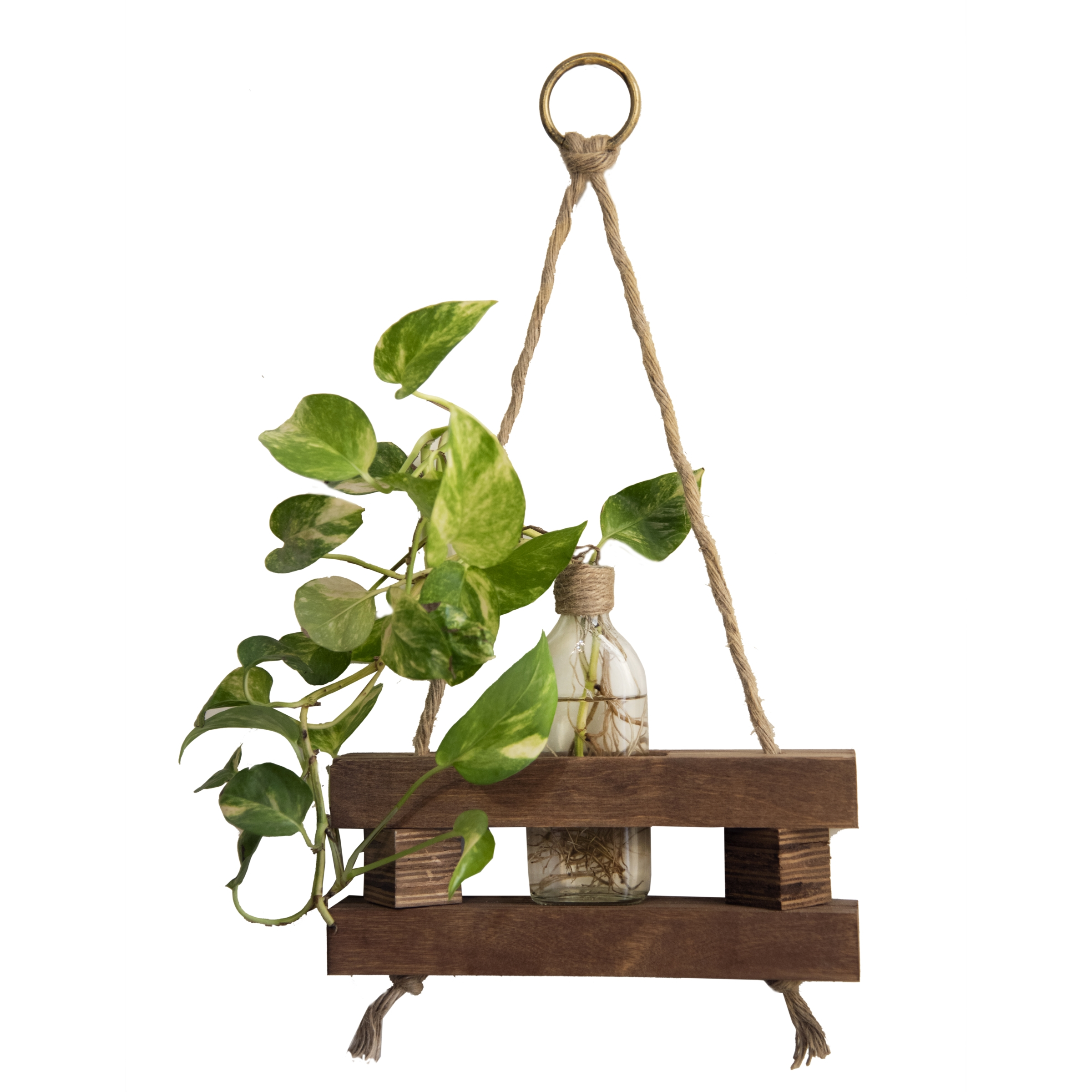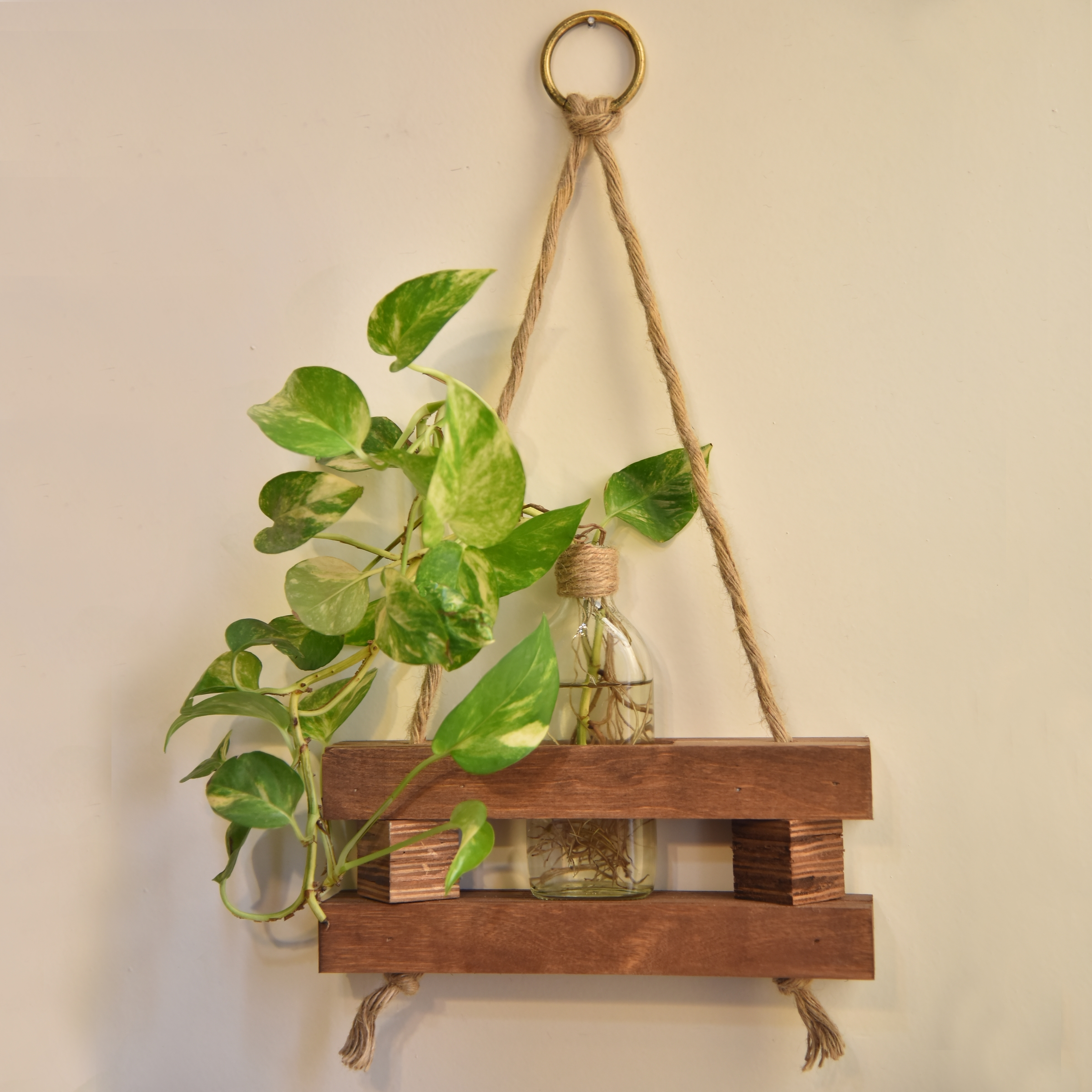 آویز گلدان چوبی دیواری در واقع گلدانی است که با نگهدارنده چوبی و به وسیله طناب کنفی به دیوار متصل می شود و شما میتوانید گل و گیاه طبیعی یا مصنوعی در گلدان شیشه ای آن قرار داده و فضای دکوراسیون منزل خود را دگرگون کنید. این آویز گلدان چوبی میتواند بهترین هدیه به عزیزانتان باشد پس اگر به دنبال کادوی مناسب هستید در خرید این آویز گلدان چوبی شک نکنید. جنس این آویز گلدان از پلی وود درجه یک بوده و از طریق حلقه ای که به طناب کنفی آن متصل شده و یک میخ کوچک به دیوار متصل می شود.
