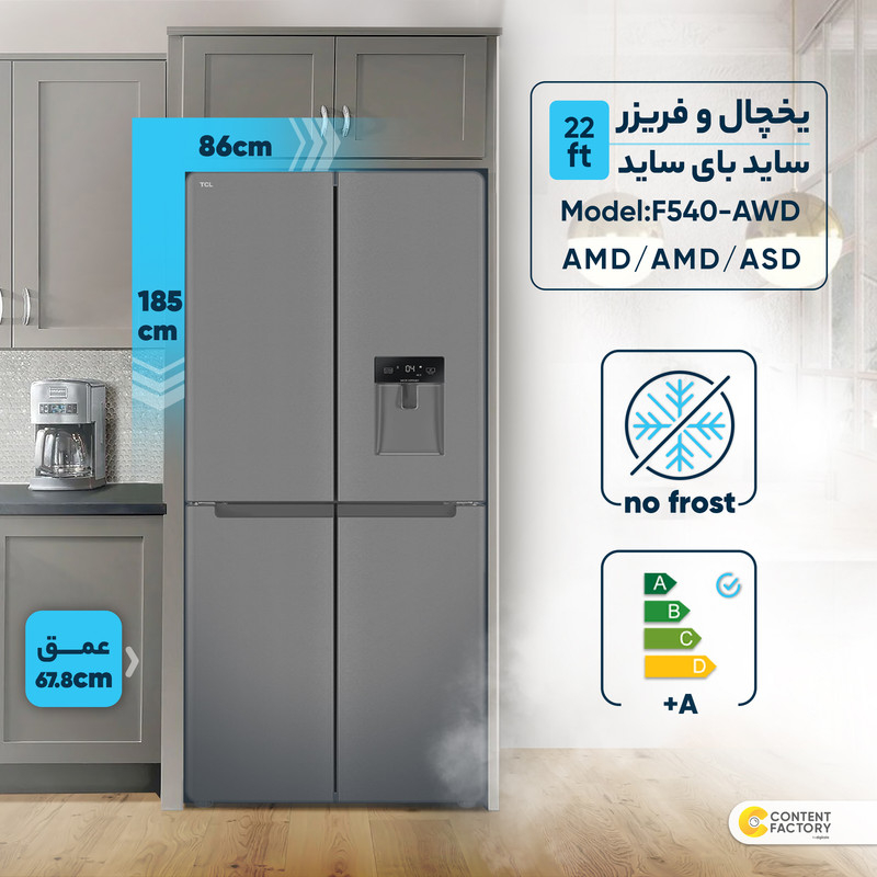 یخچال و فریزر تی سی ال مدل F540-AWD/AMD/AMD/ASD محصولی از برند « تی سی ال » (TCL) است که با طراحی ۴ در روانه بازار شده است. گنجایش یخچال در این محصول برابر با ۲۹۶ لیتر و گنجایش فریز برابر با ۱۳۳ لیتر است. داخل یخچال و طبقاتی در نظر گرفته شده است تا مواد غذایی و ظروف مرتب چیده شوند. این محصول به صورت نوفراست (No Frost) است. قابلیت برفکزدایی خودکار این محصول، بهطور خودکار یخها را ذوب و آب حاصل از برفکزدایی را بدون دخالت کاربر تبخیر میکند. یخچال و فریزر تی سی ال مدل F540-AWD/AMD/AMD/ASD دارای برچسب انرژی A+ است که آن را در رده کالاهای کممصرف قرار میدهد. طراحی داخلی بهینه در هر دو بخش یخچال و فریزر آن انجامشده است تا فضای بزرگی برای استفاده در اختیار کاربر قرار بگیرد. این یخچال فریزر برای خانوادههایی با جمعیت متوسط گزینهی بسیار خوبی محسوب شده و باعث میشود بتوانند مواد غذایی موردنیازشان را حفظ کنند.